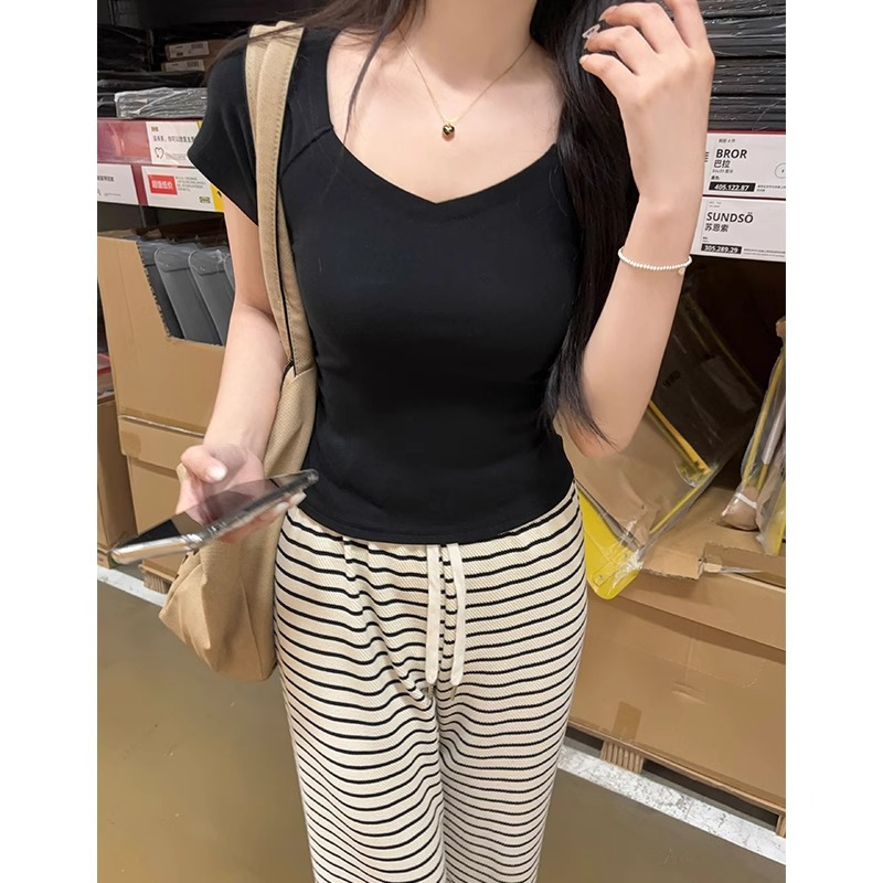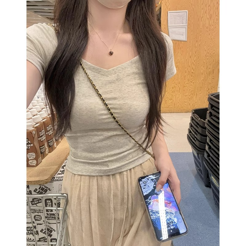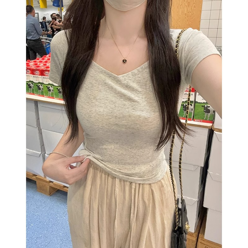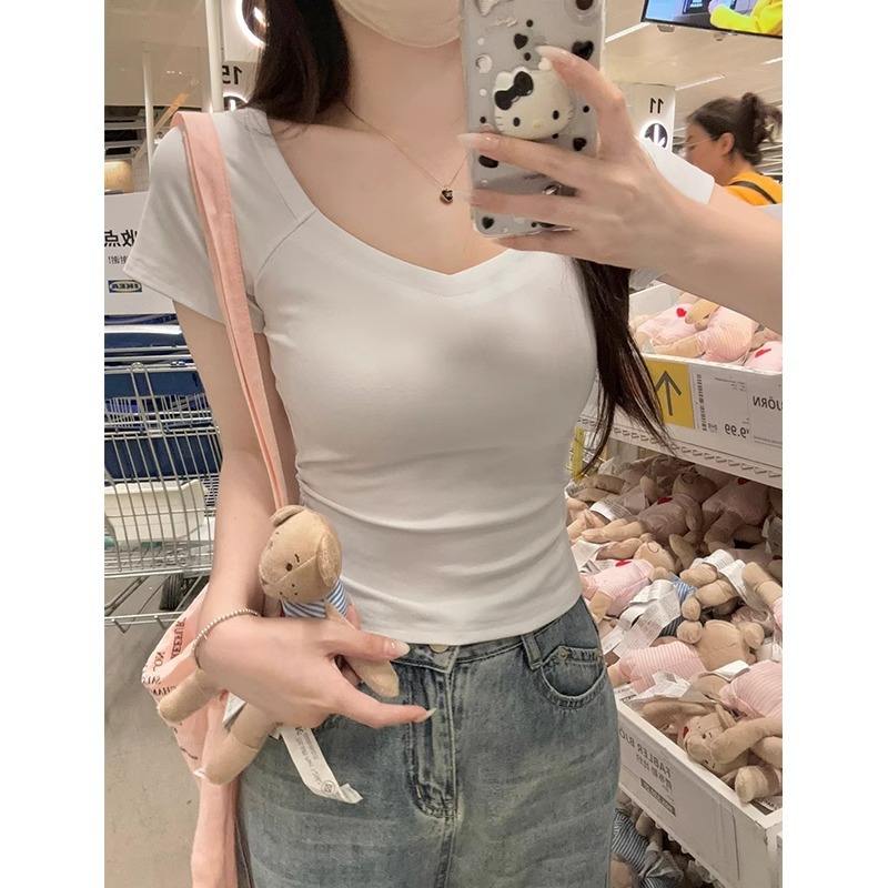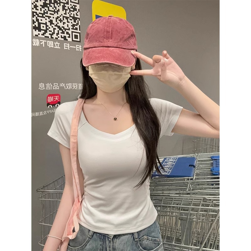 白色V领正肩短袖T恤女夏新款修身显瘦简约休闲小个子通勤上衣