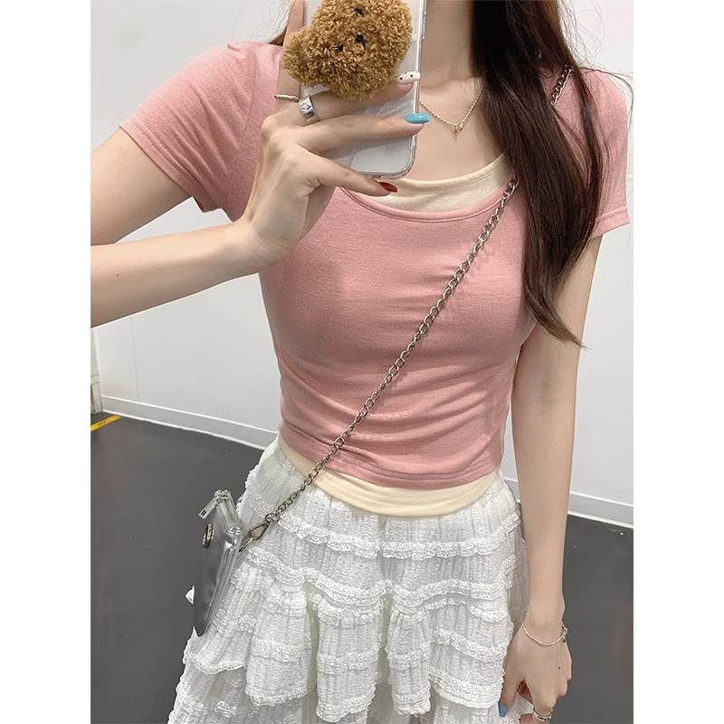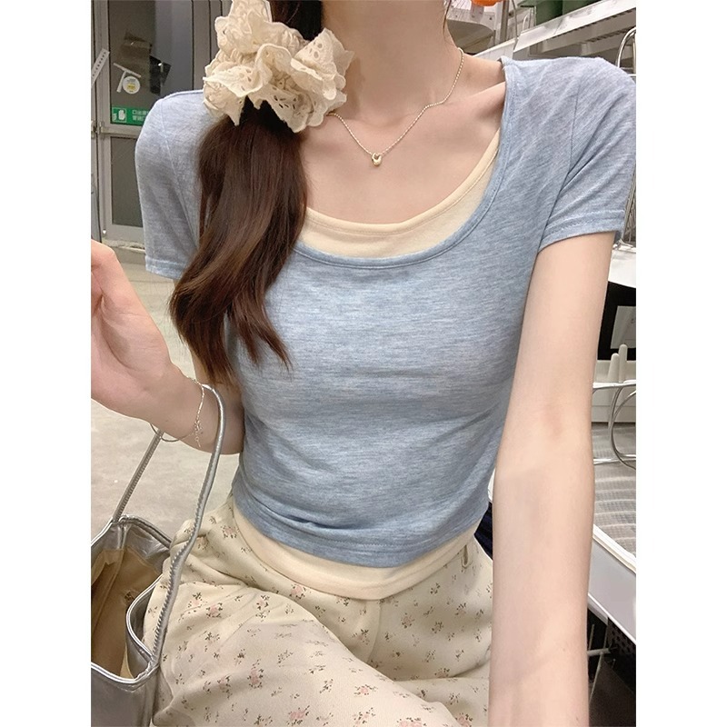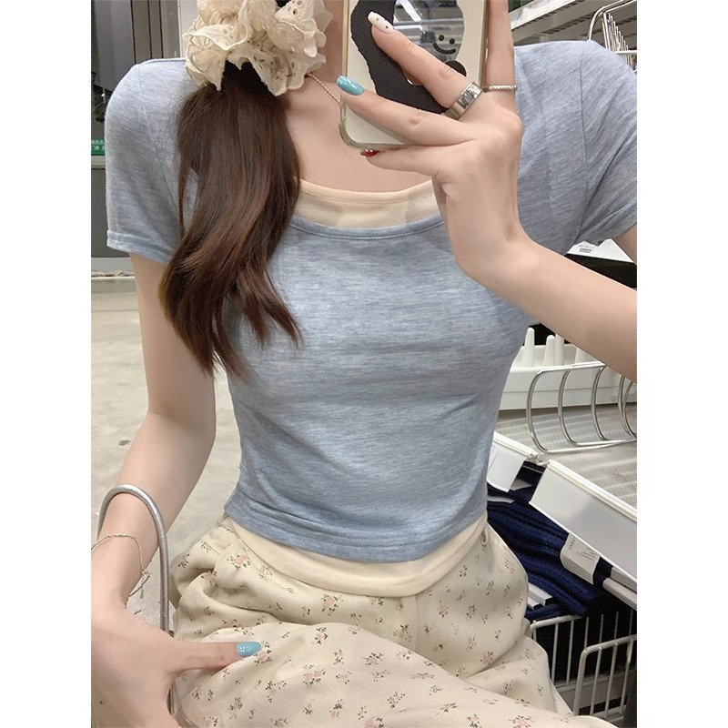 蓝色纯欲大u领露锁骨假两件拼色短袖女夏季小飞袖正肩t恤短款上衣