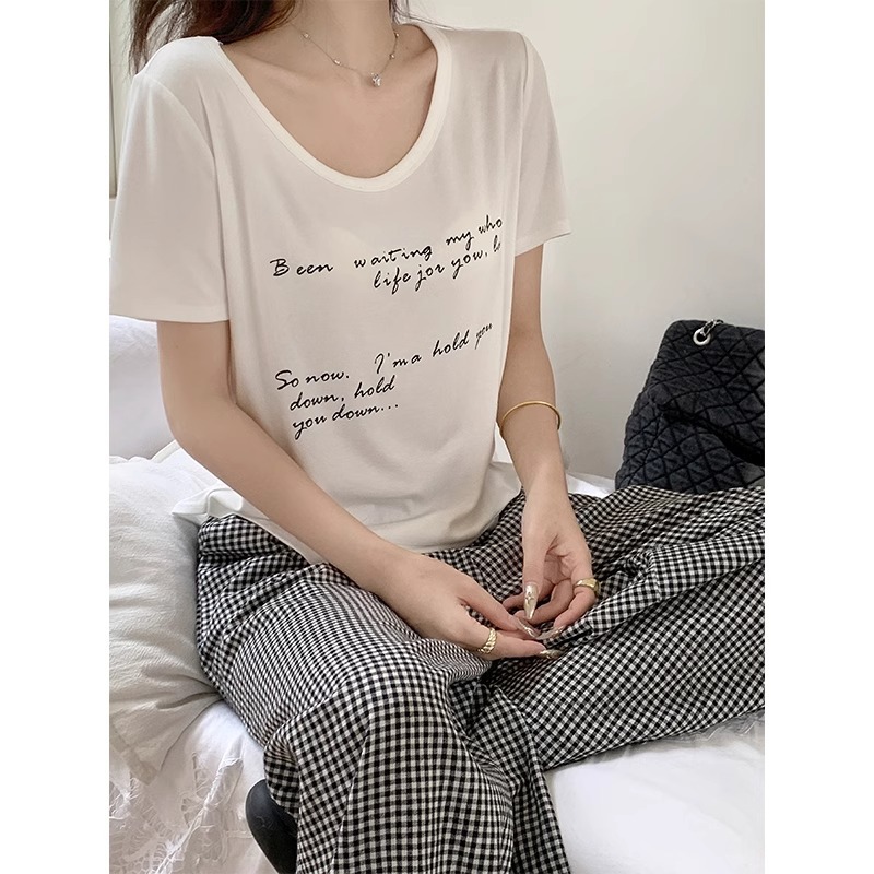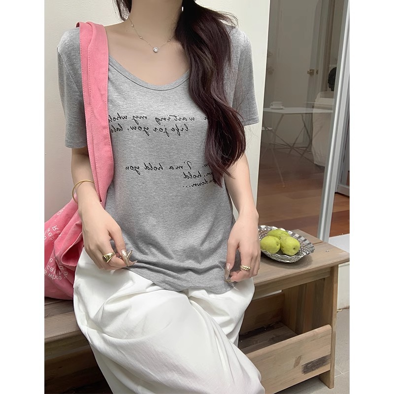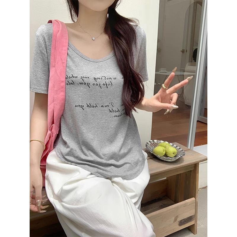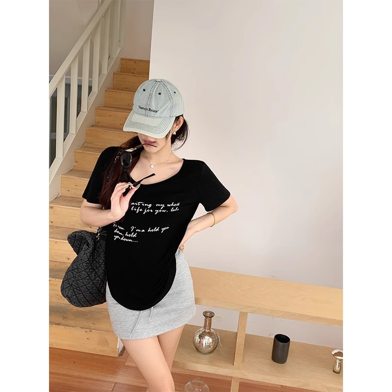 休闲百搭U领短袖T恤女夏宽松慵懒风弧形下摆字母印花设计感小上衣