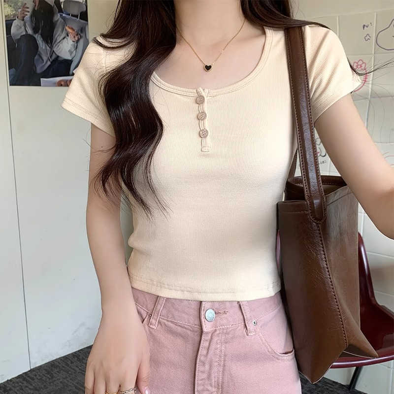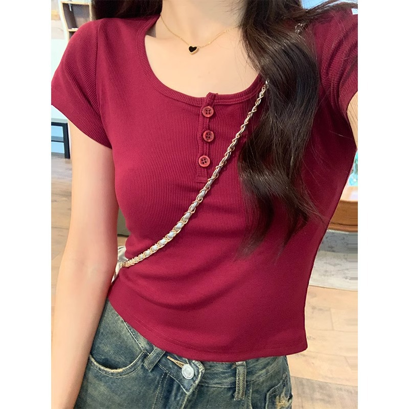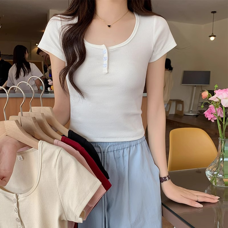 小个子紧身辣妹U领正肩短袖T恤女春夏新款基础百搭露锁骨性感上衣