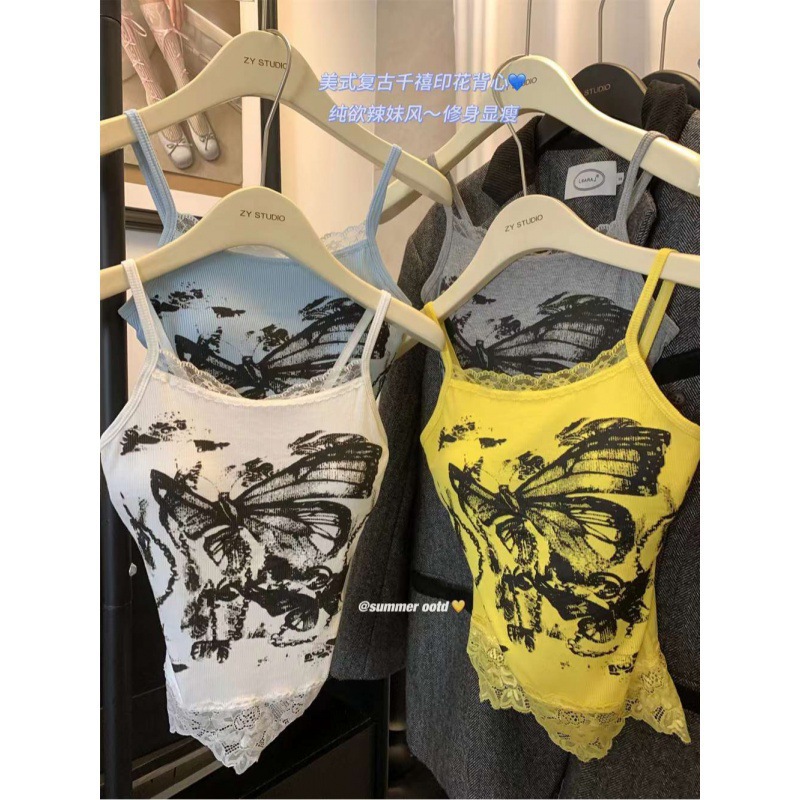 蕾丝花边印花吊带背心女夏秋季辣妹甜酷风修身显瘦短款外穿上衣潮