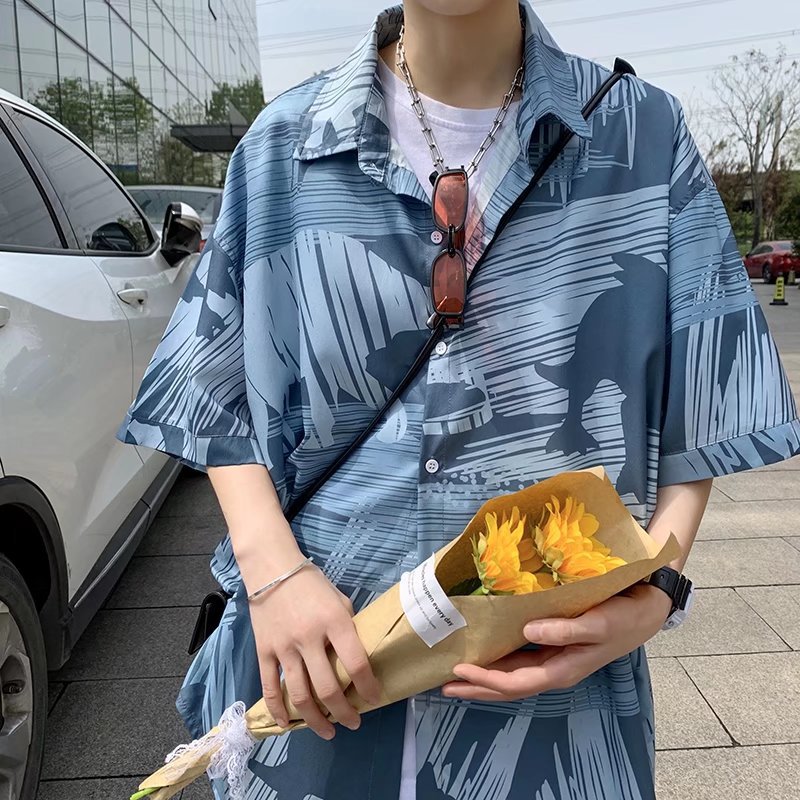 复古花衬衫男短袖夏季薄款港风日系潮流外套男帅气设计感小众衬衣