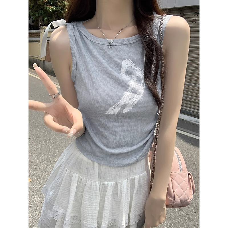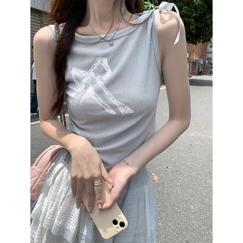设计感小众蝴蝶结印花短款小吊带背心女防走光抽绳收腰辣妹上衣夏