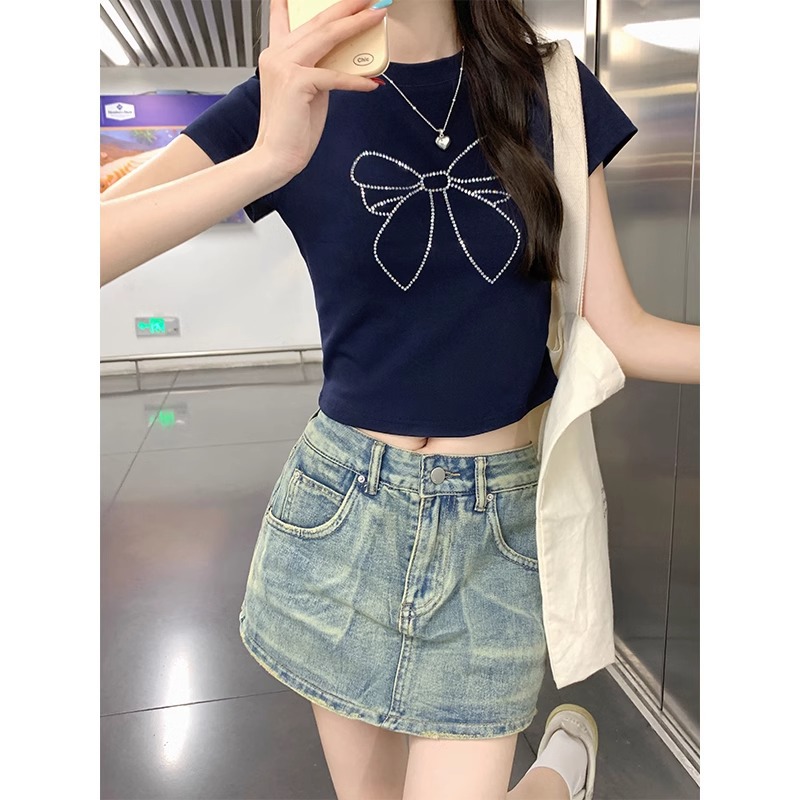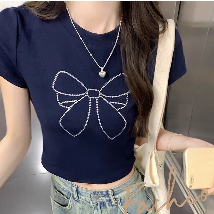 藏蓝色蝴蝶结烫钻圆领正肩短袖T恤女夏小个子修身bm短款露脐上衣