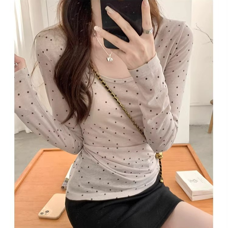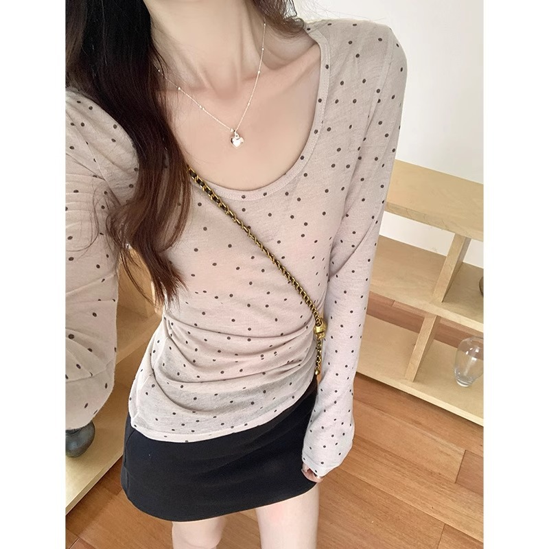 杏色波点印花u领长袖T恤女夏季外穿甜辣妹修身显瘦露锁骨防晒上衣