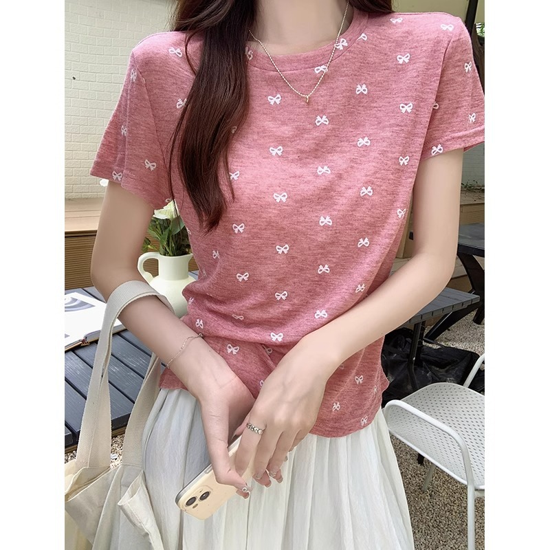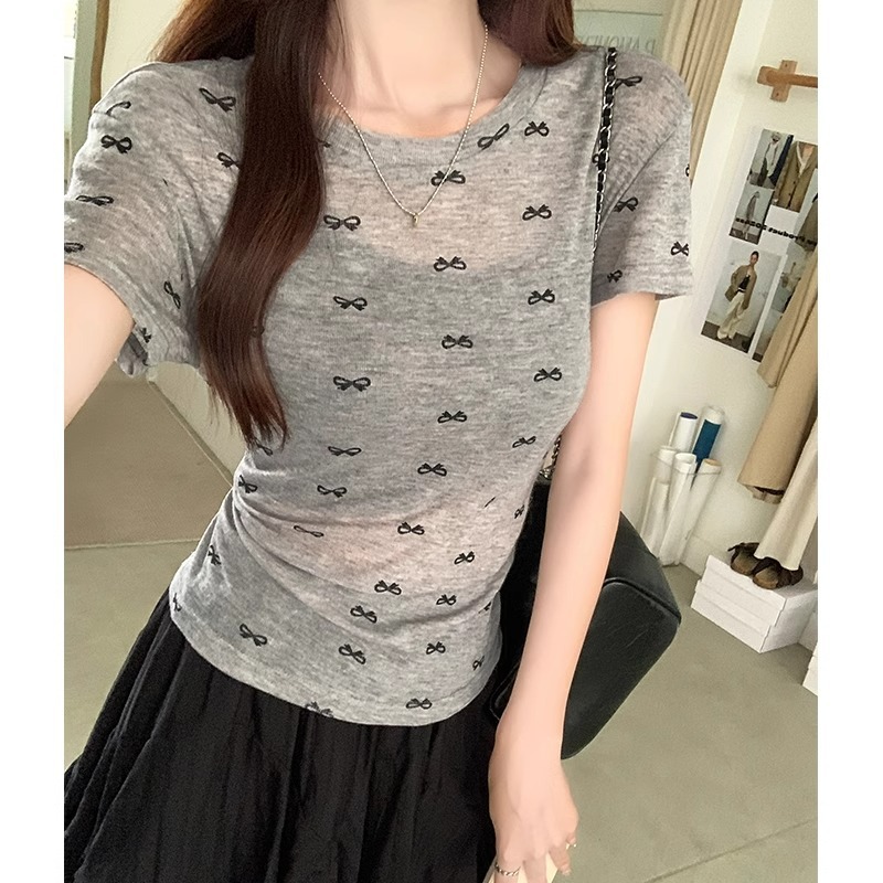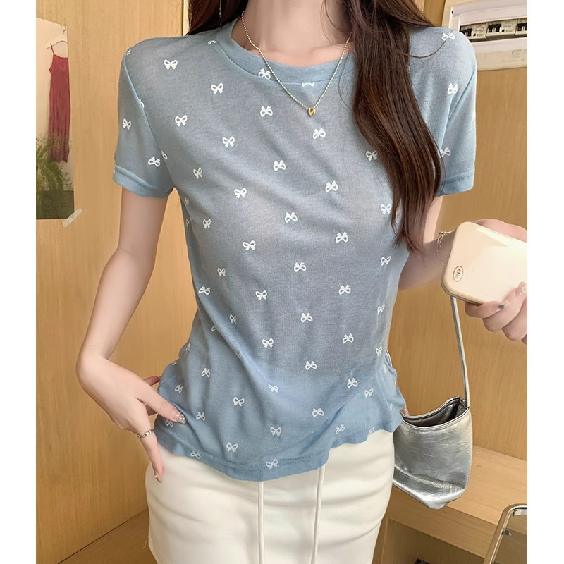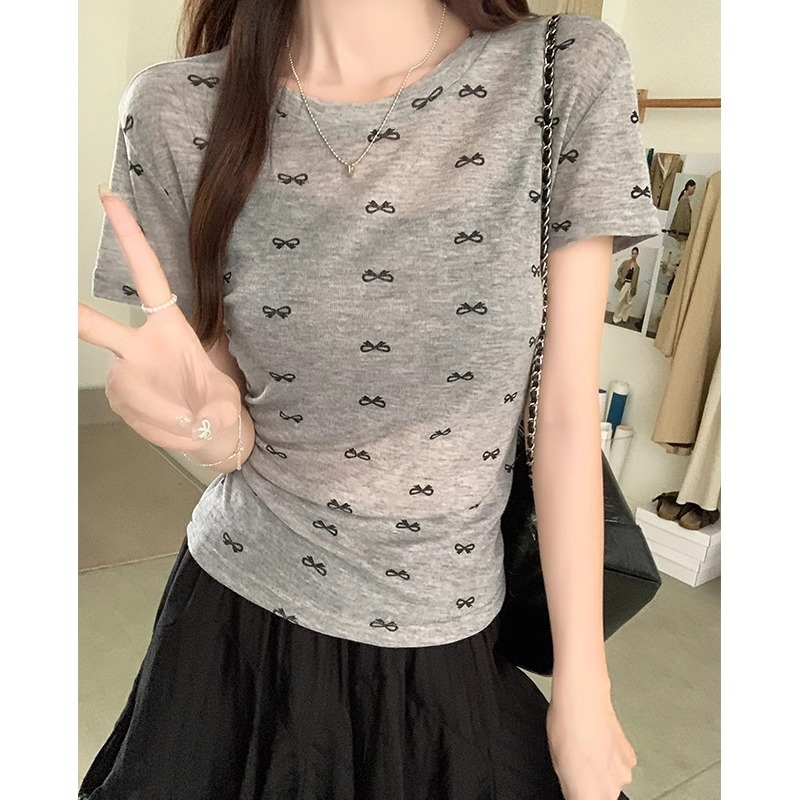 韩版纯色蝴蝶结印花上衣辣妹微透纯欲正肩修身短袖夏季T恤女