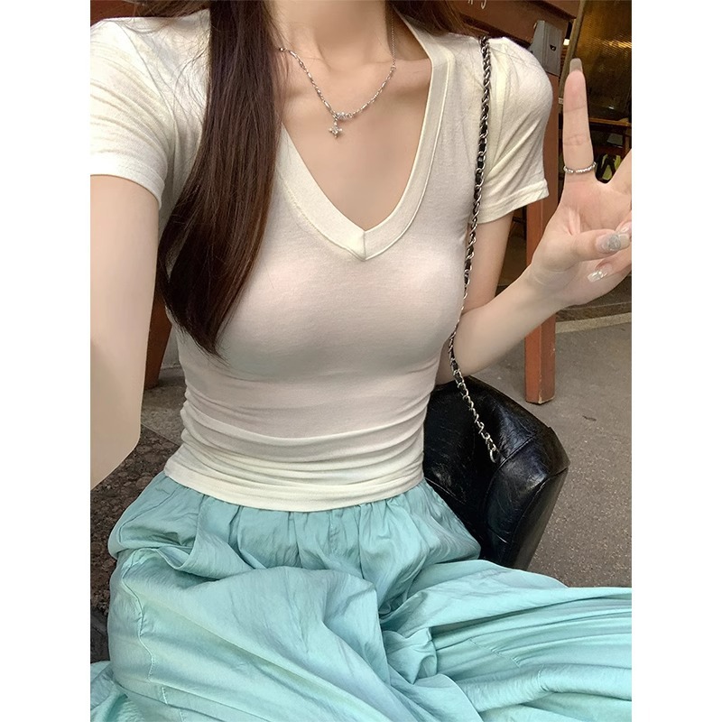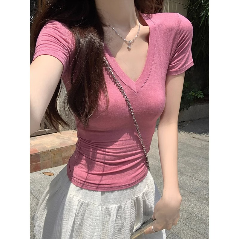 粉色纯欲v领露锁骨薄款软糯短袖正肩辣妹t恤女夏修身掐腰短款上衣