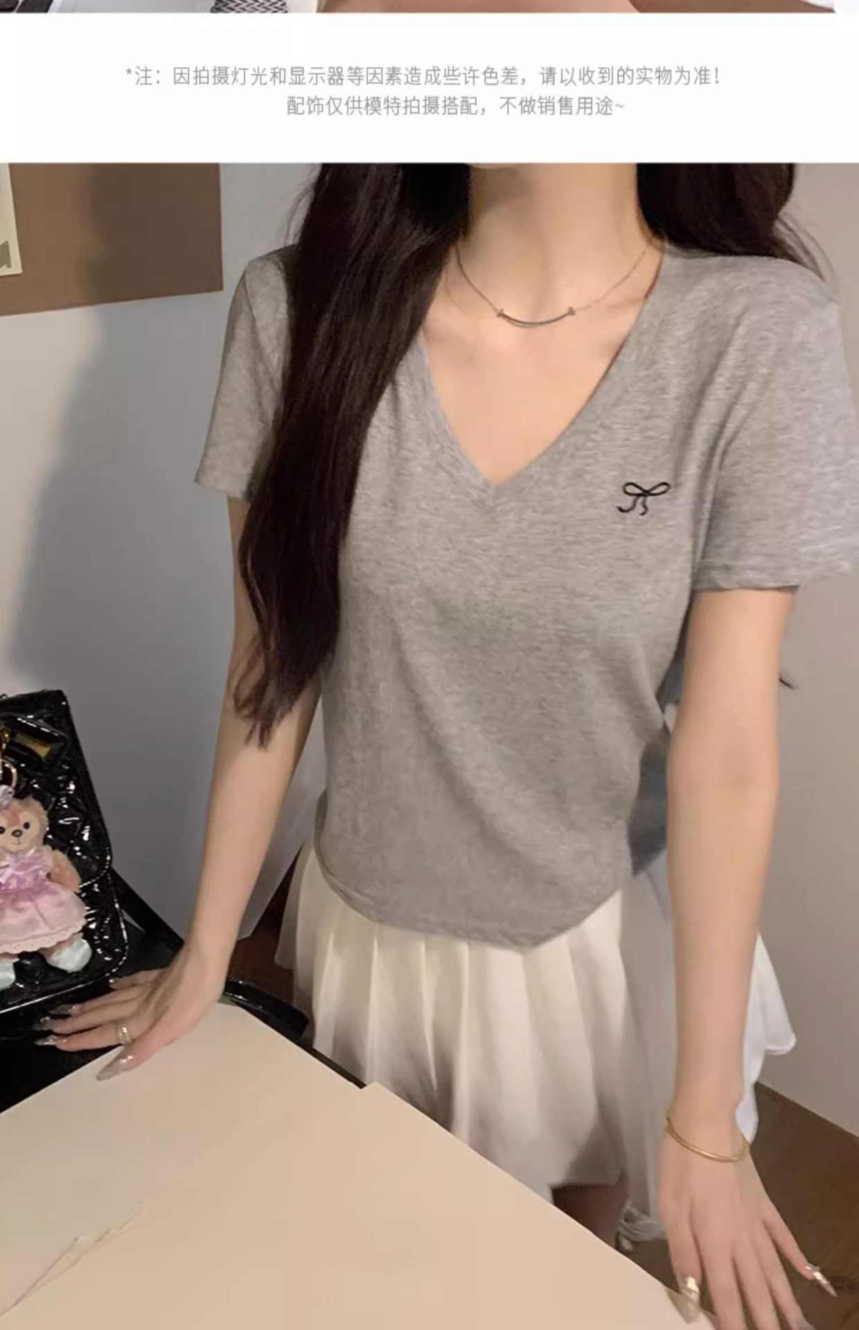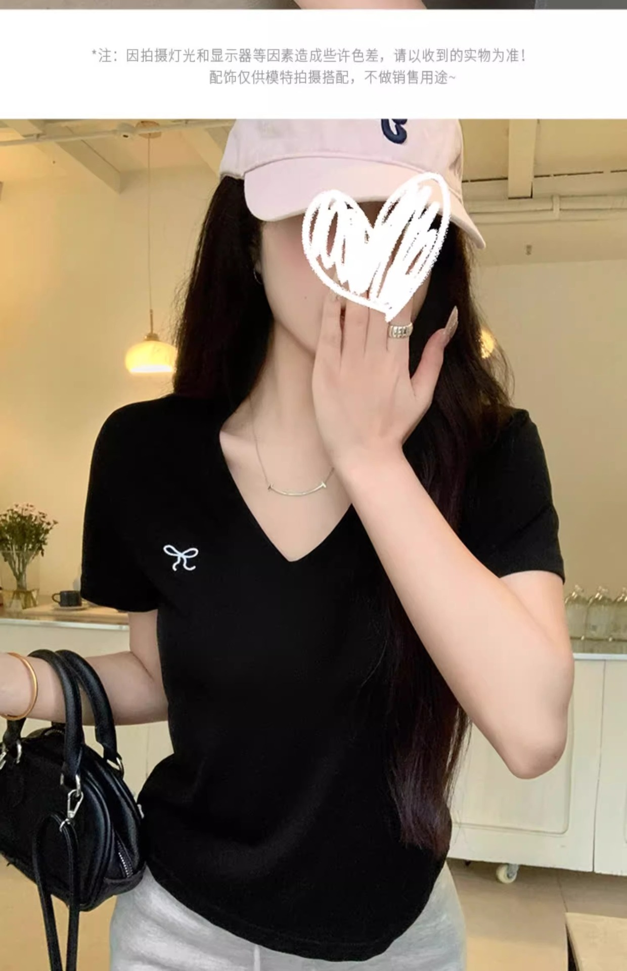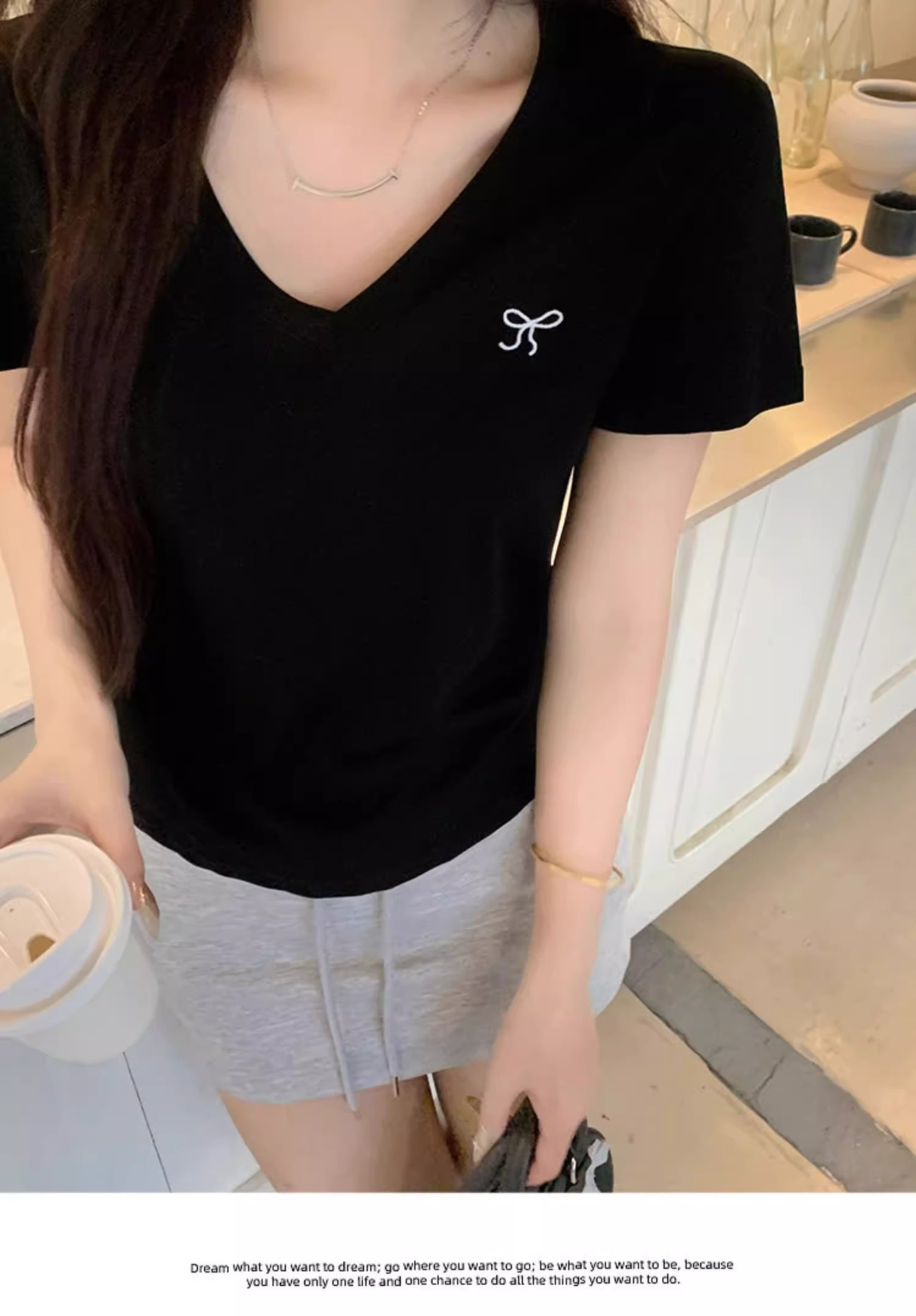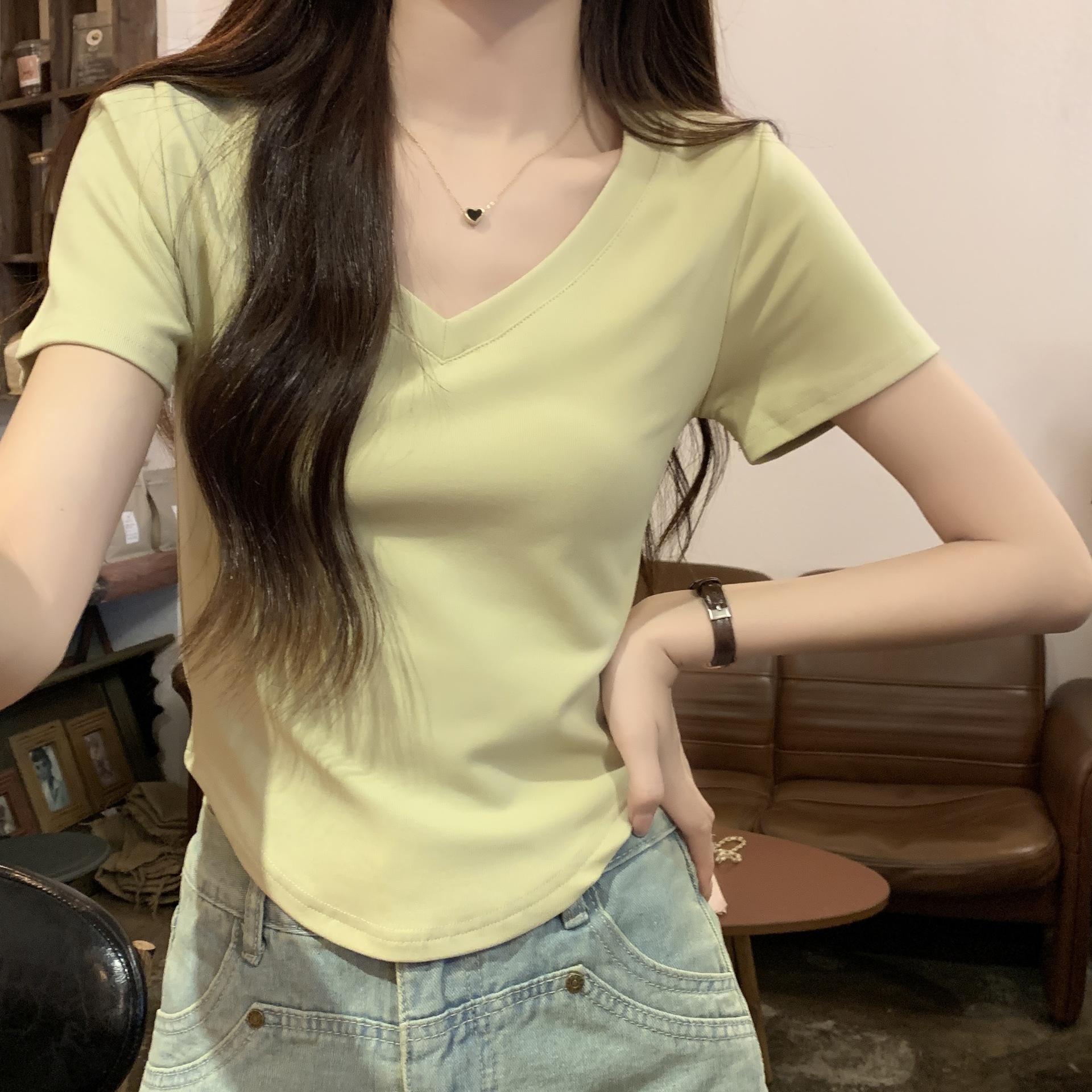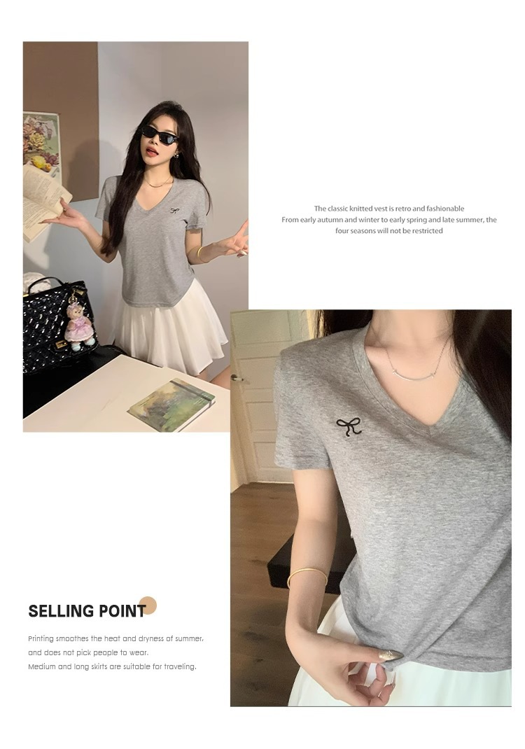 欧货v领短袖t恤女夏装新款正肩高级感休闲宽松体恤ins潮