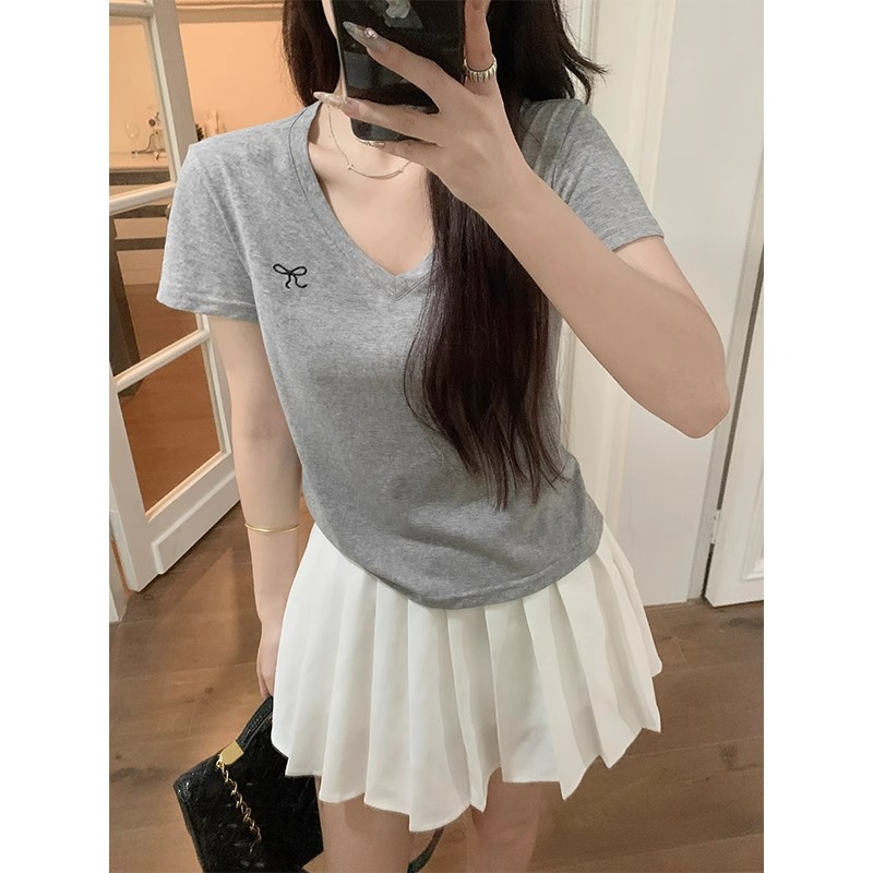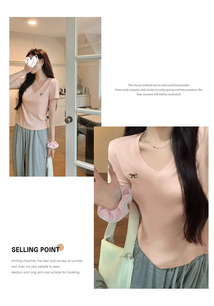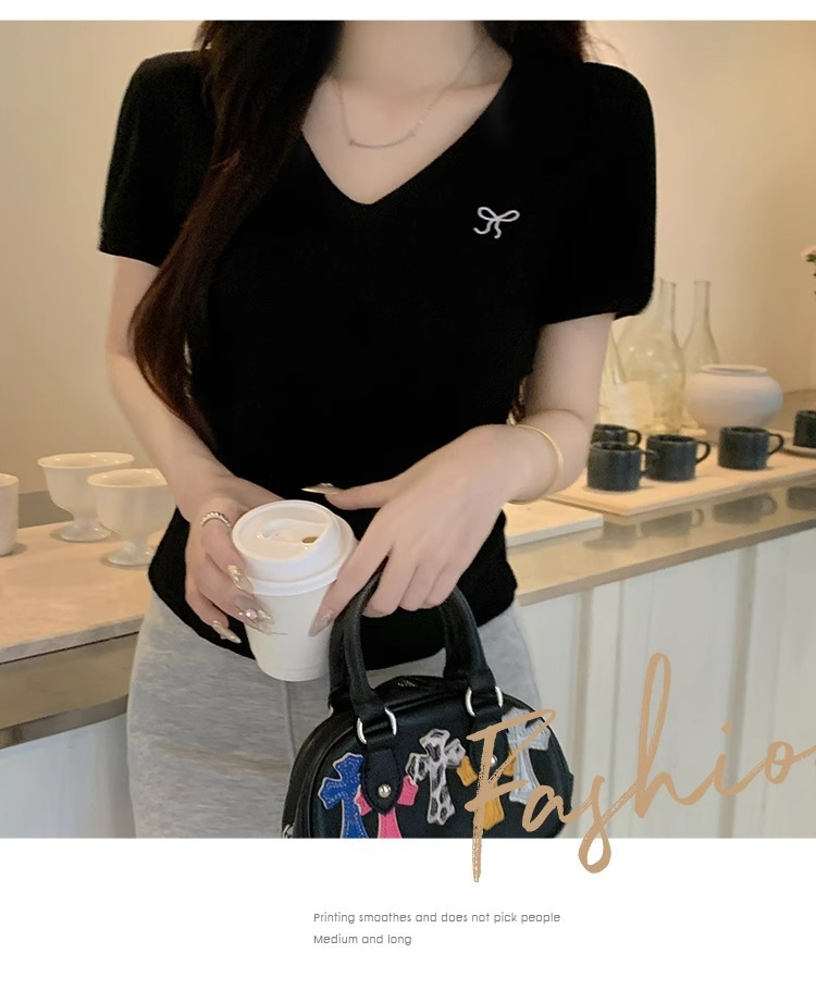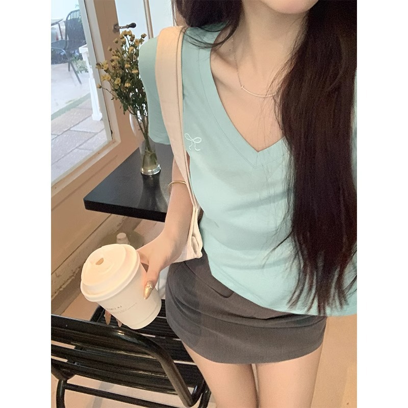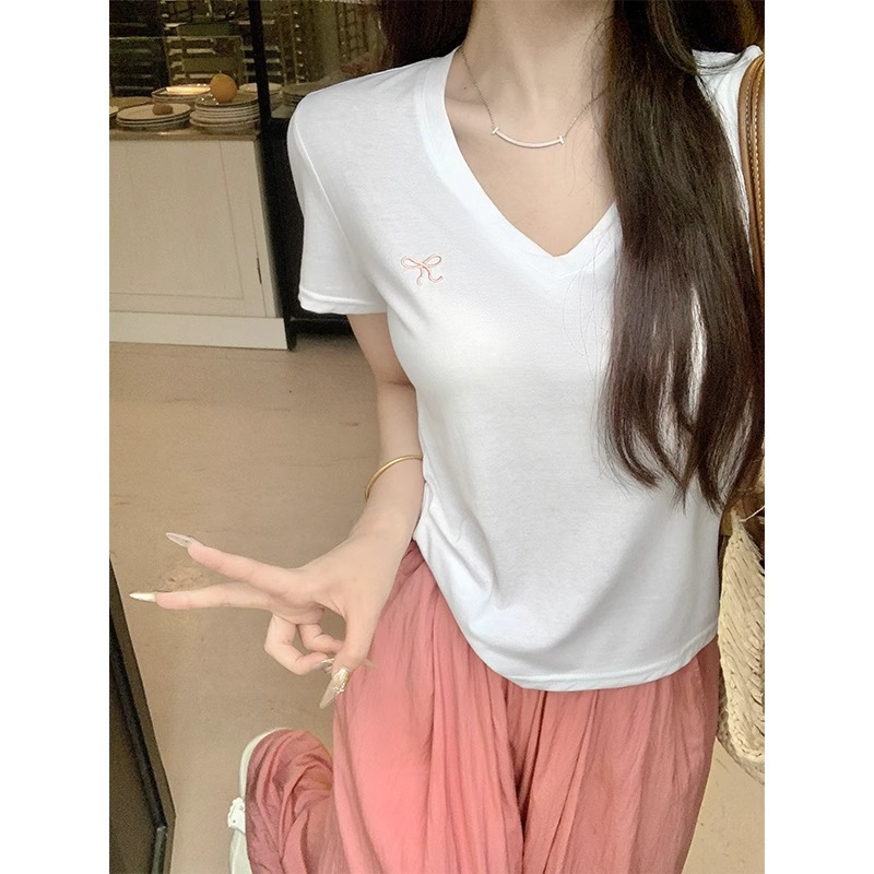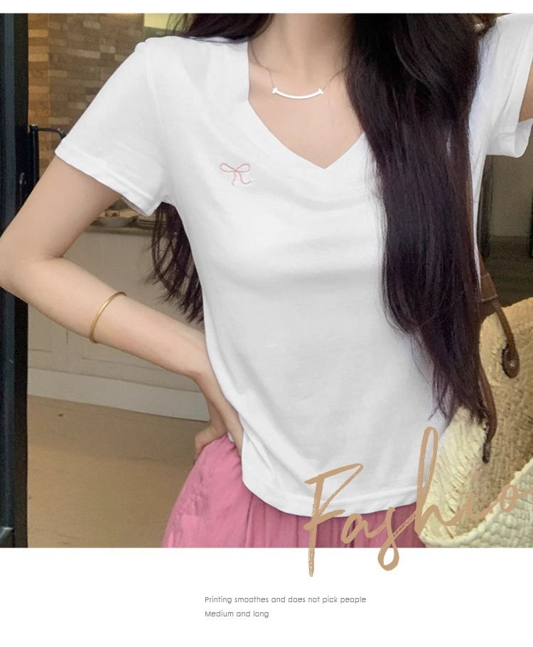 雪花棉蝴蝶结刺绣v领露锁骨凉感t恤女夏修身辣妹短袖正肩短款上衣