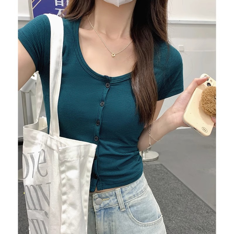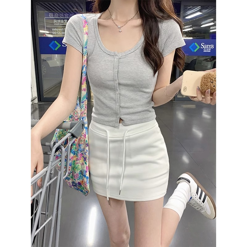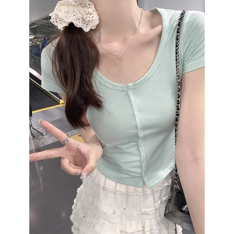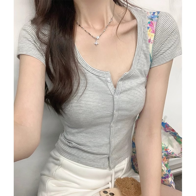纯欲条纹短袖t恤女夏季新款设计感小众独特性感辣妹修身短款上衣