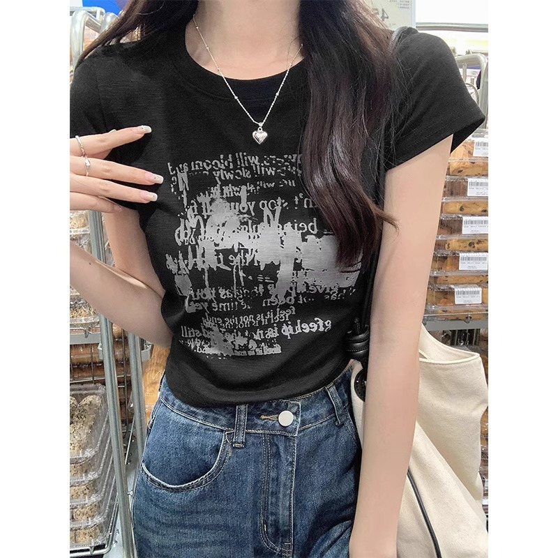 港味chin印花圆领正肩t恤上衣女夏季设计感小众褶皱收腰辣妹短袖