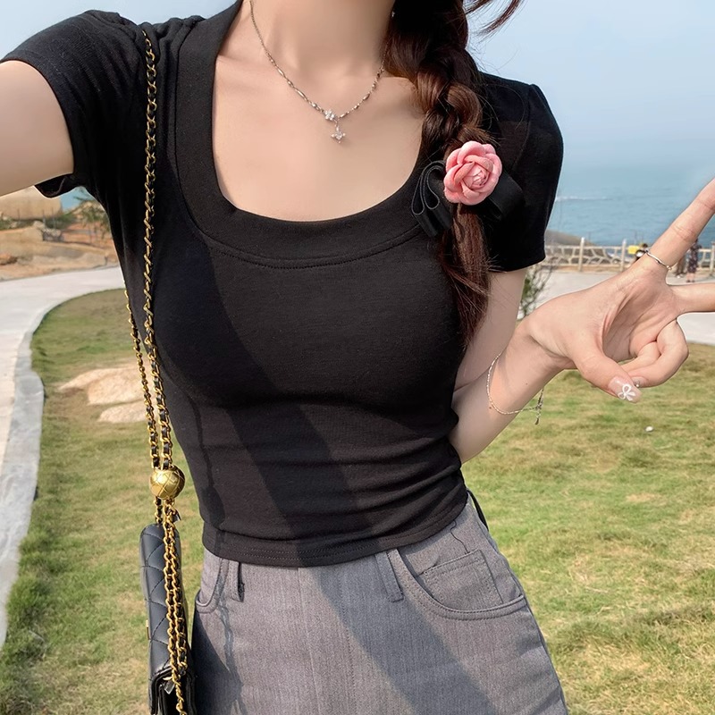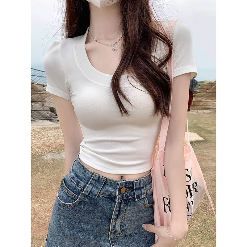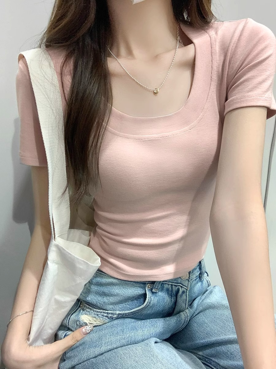 杏色大领口短袖T恤女夏季修身显瘦别致甜辣妹u领正肩短款打底上衣