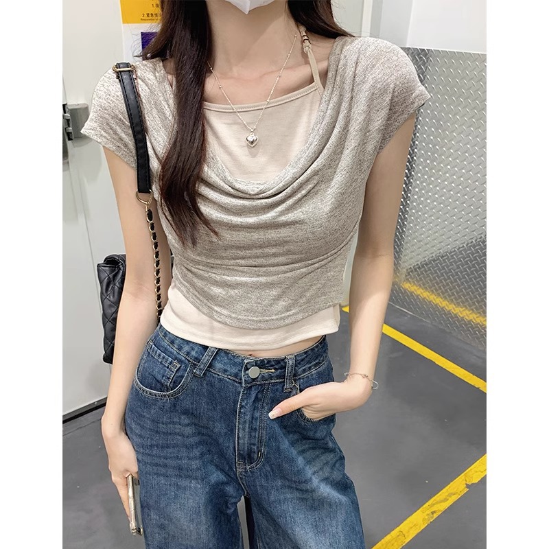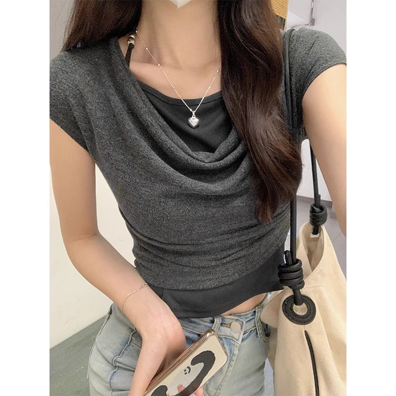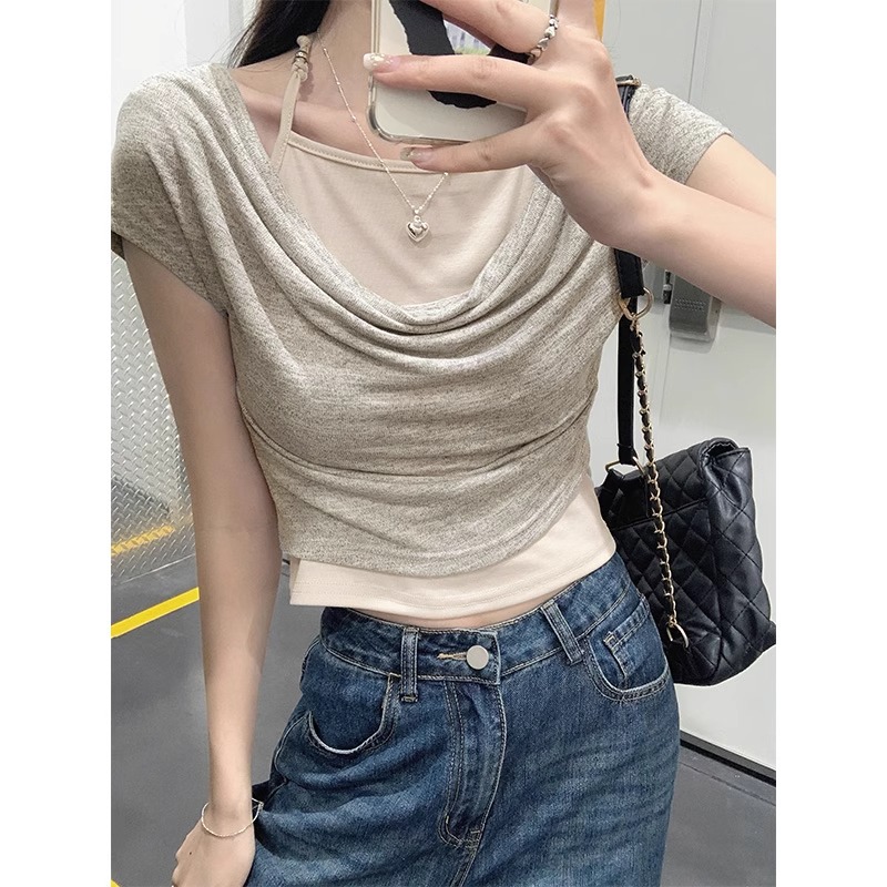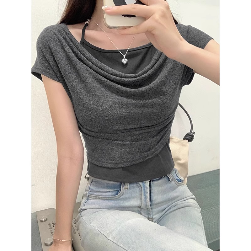 小众设计感短袖T恤女夏季新款修身显瘦荡领一字肩挂脖短款上衣潮
