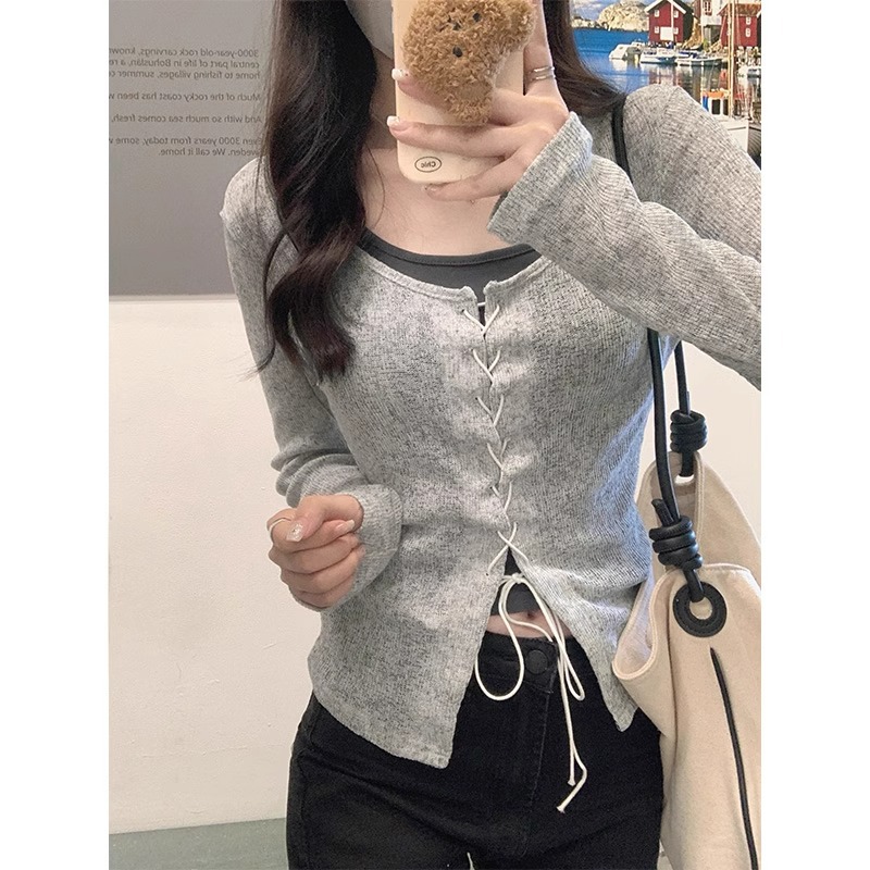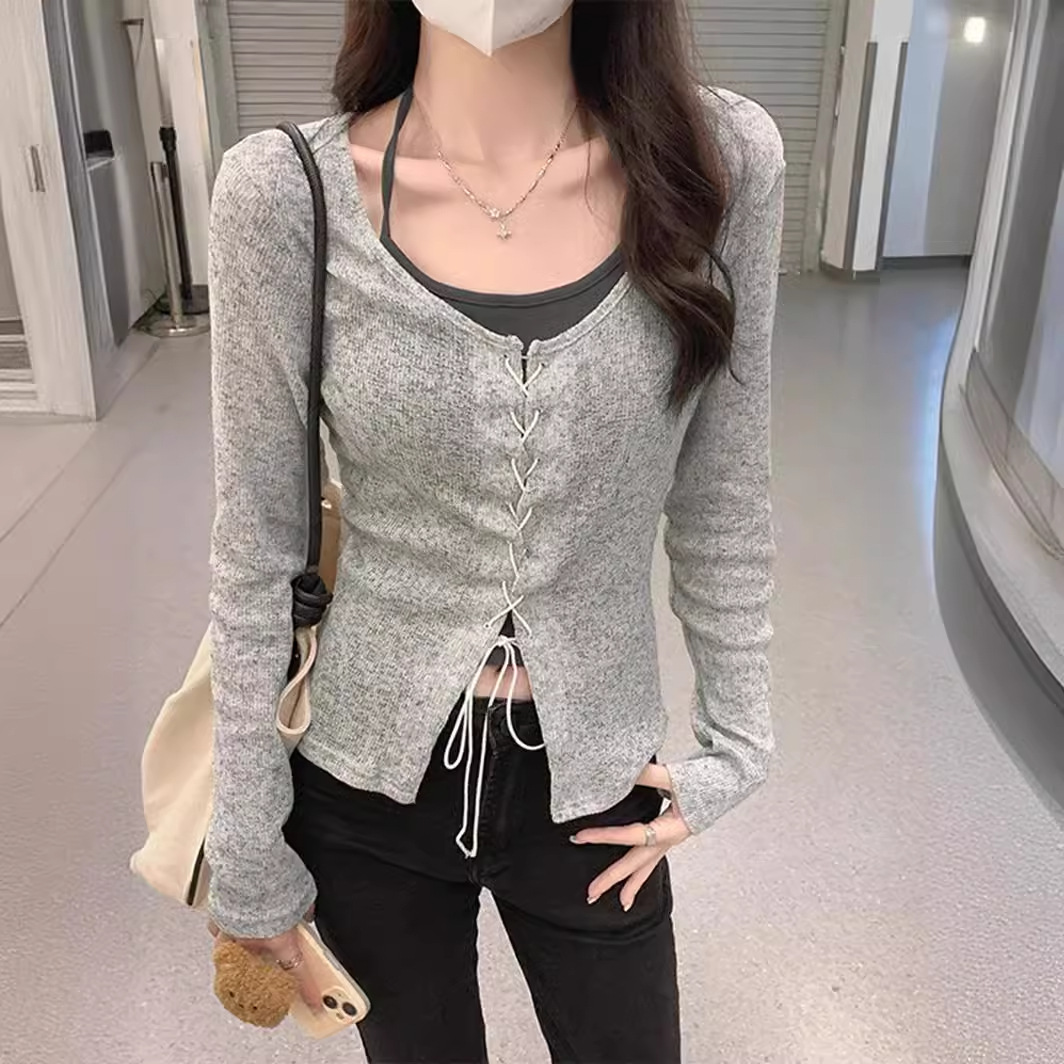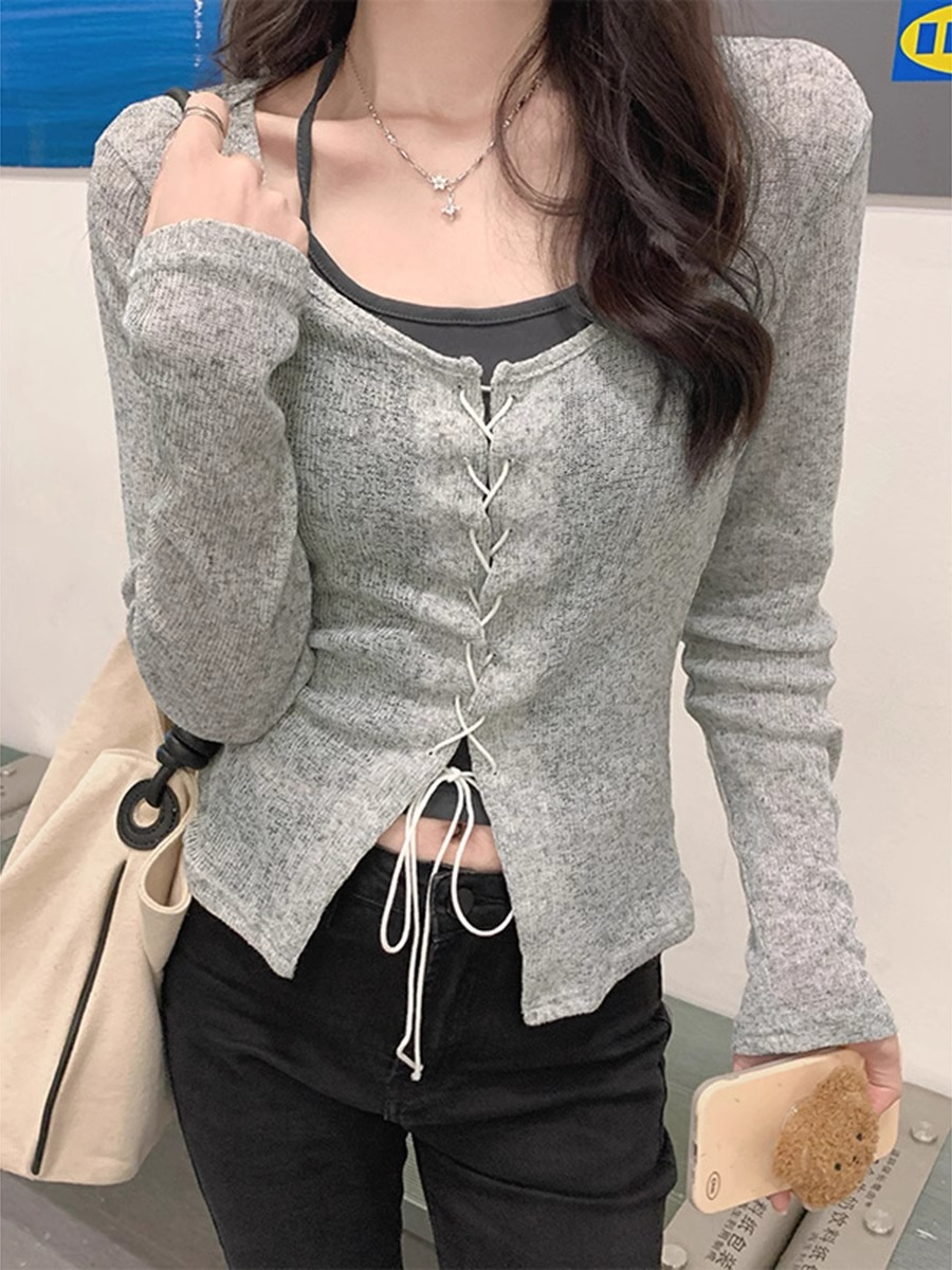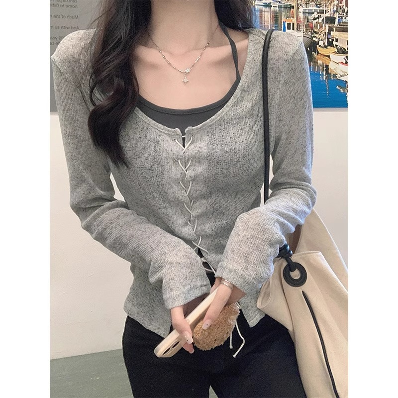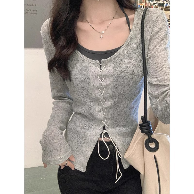 小心机甜辣妹修身春季新款绑带设计感露锁骨挂脖吊带上衣套装