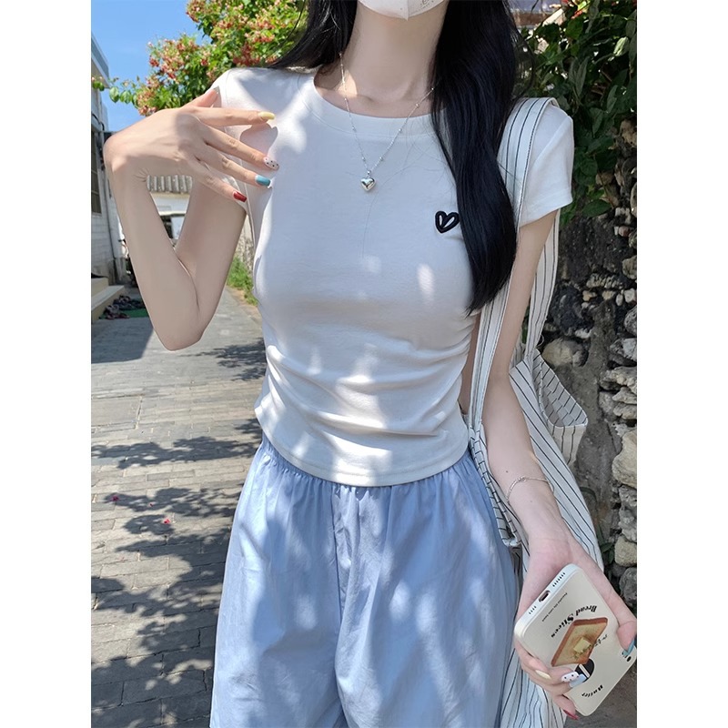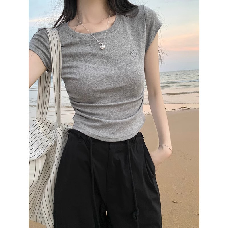 韩系纯色圆领减龄正肩腰部褶皱刺绣夏季短袖T恤修身显瘦短款上衣