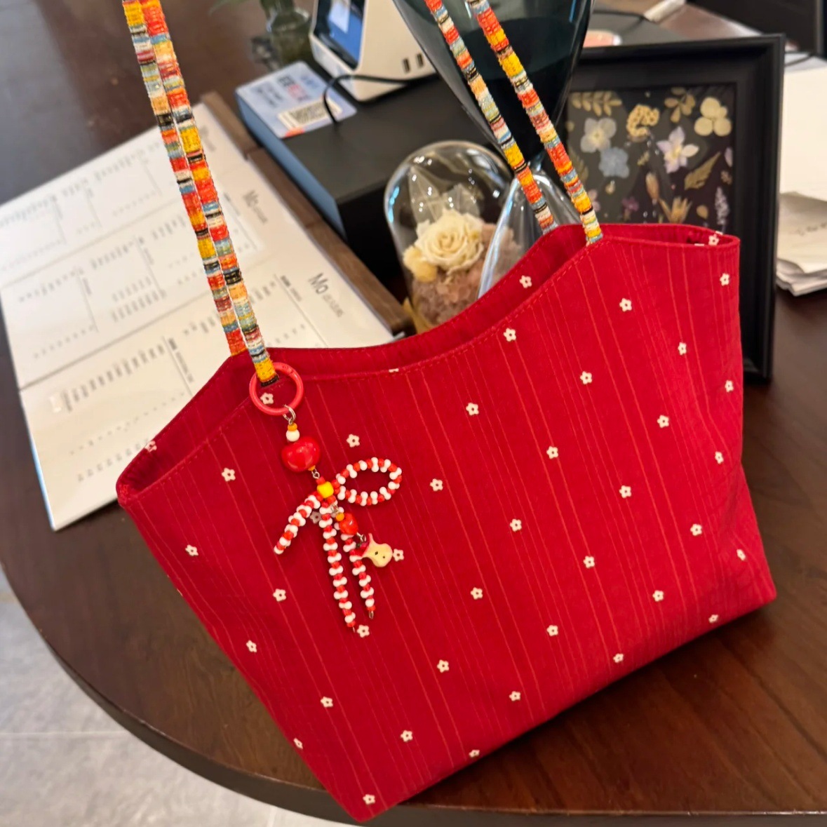 韩系红色花朵帆布包女2025新款撞色编织单肩托特包通勤手提