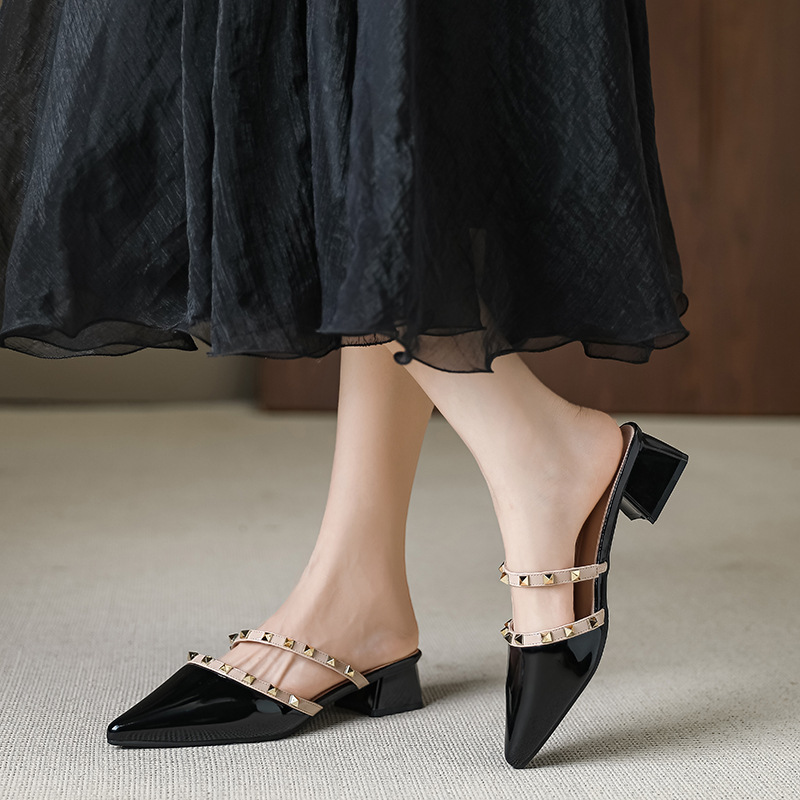 包头半拖鞋女夏外穿新款配裙子粗跟尖头低跟软皮单鞋穆勒鞋
