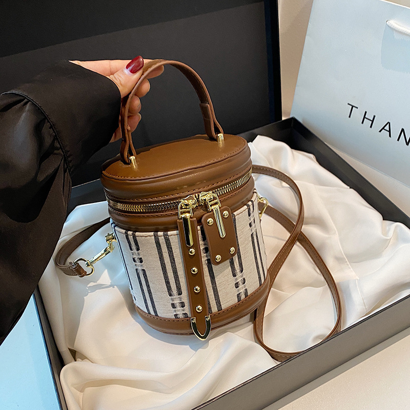 单肩包复古撞色拼接质感水桶包圆筒百搭大容量化妆通勤包包女