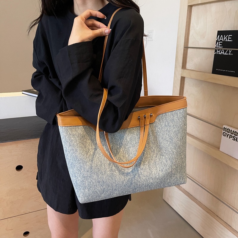 休闲通勤大容量包包女秋冬新款牛仔布单肩包高级感撞色托特包