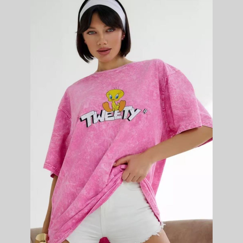 oversize趣味卡通复古纯棉百搭蜡染水洗做旧宽松洗水短袖T恤女潮