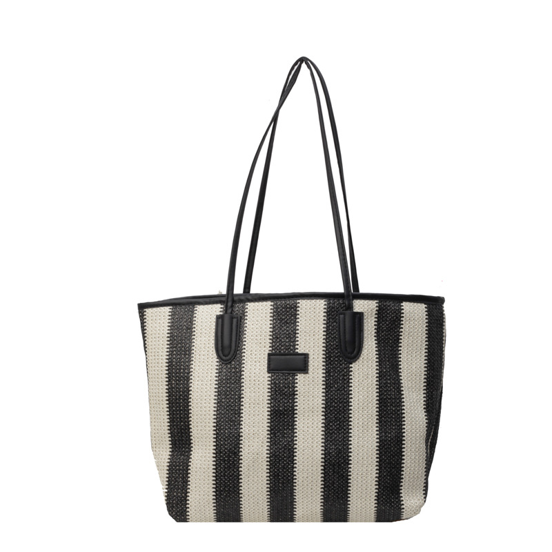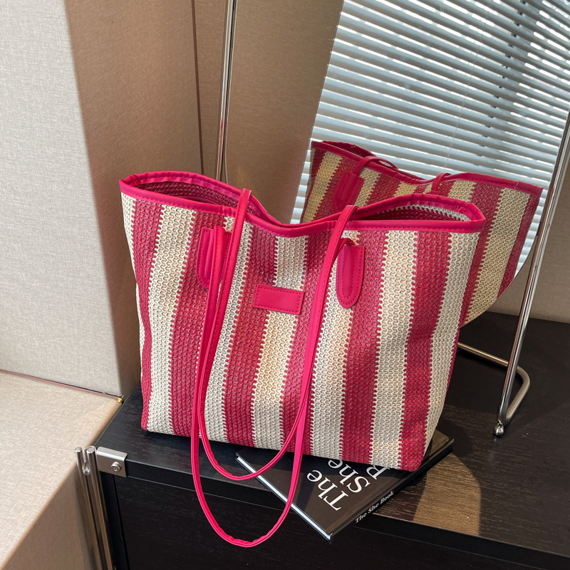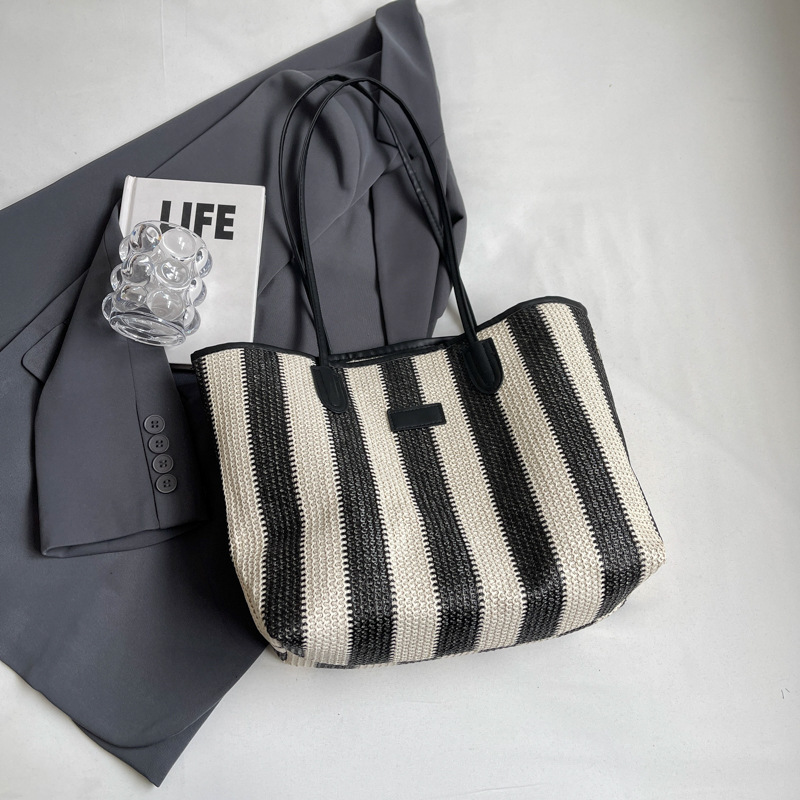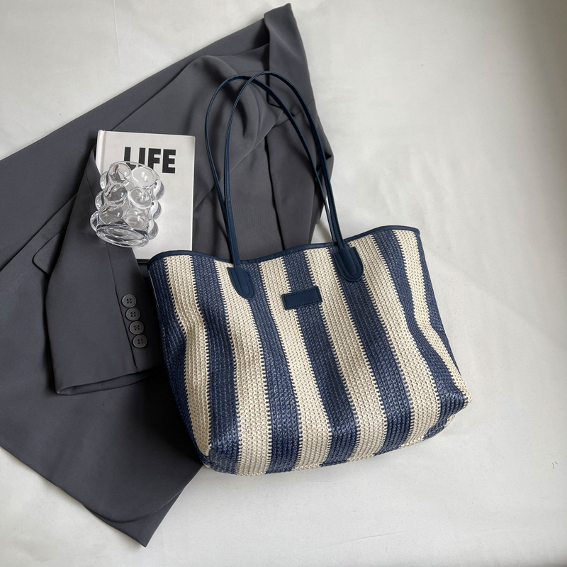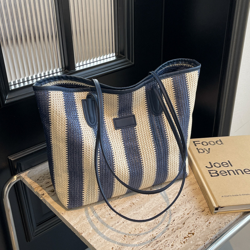 大容量编织时尚包包女春季新款条纹通勤单肩包上课休闲托特包