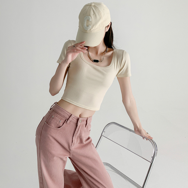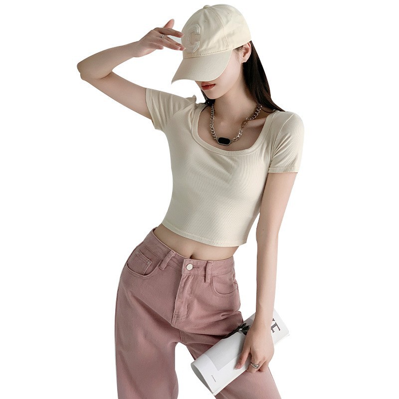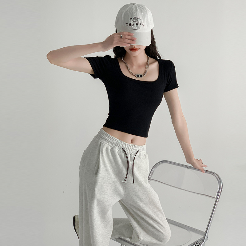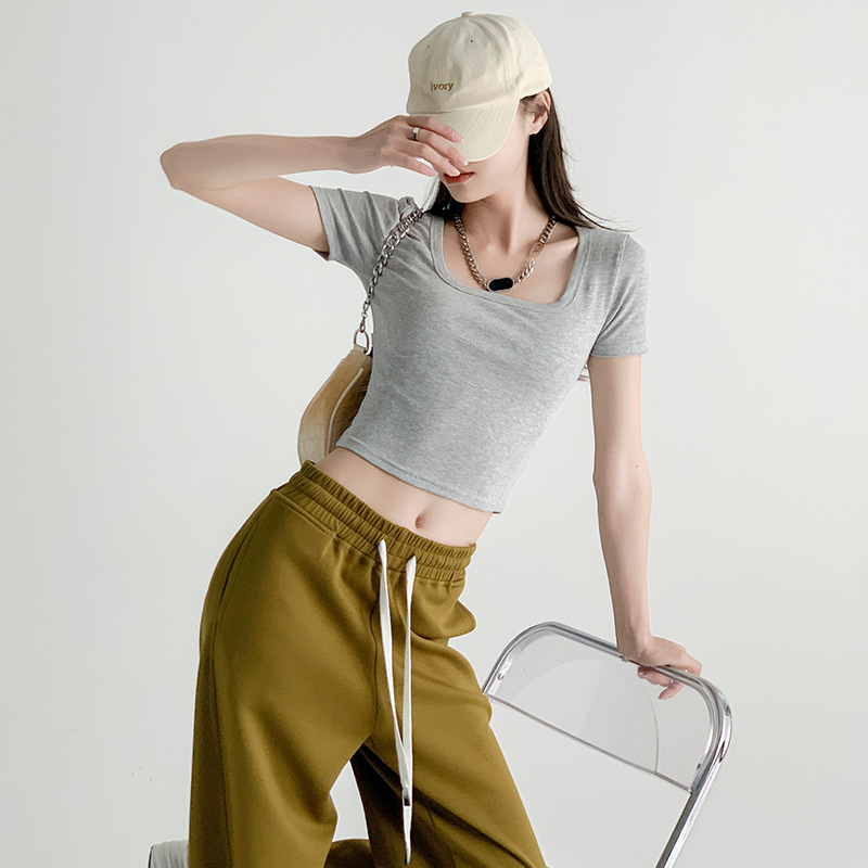 方领正肩短袖女夏季新款漏腰背心短款t恤打底衫外穿白色上衣