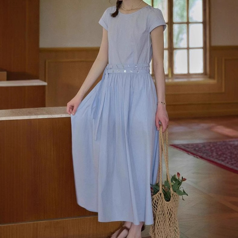 上身巨好看~通勤蓝色腰部裙简约短袖连衣裙女小个子夏感棉a字裙