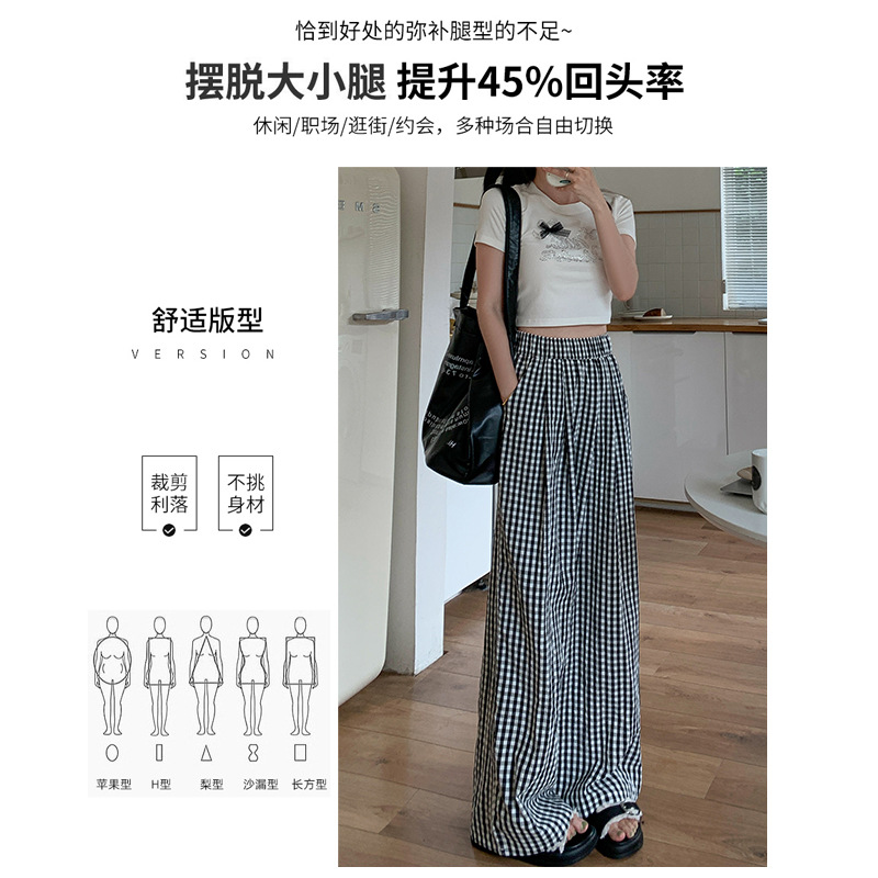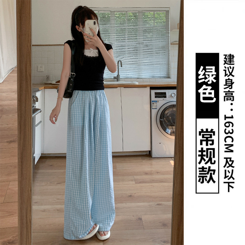蓝色格子阔腿裤夏女垂感新款高腰垂感休闲裤直筒山本裤遛弯裤