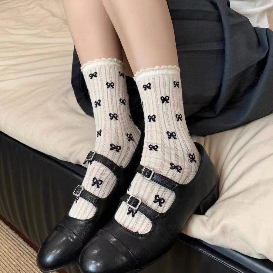 miu系芭蕾风堆堆袜子女中筒袜夏季薄款网眼镂空日系蝴蝶结波点袜