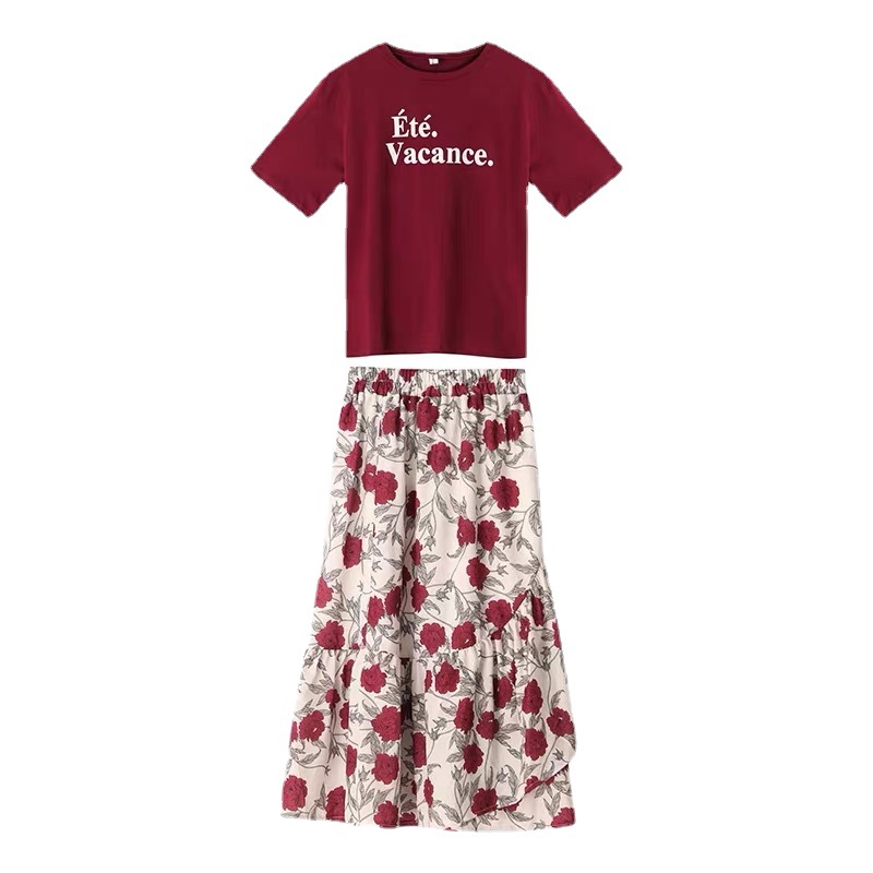 夏季新款减龄小个子网红御姐显瘦气质T恤碎花半身裙两件套装