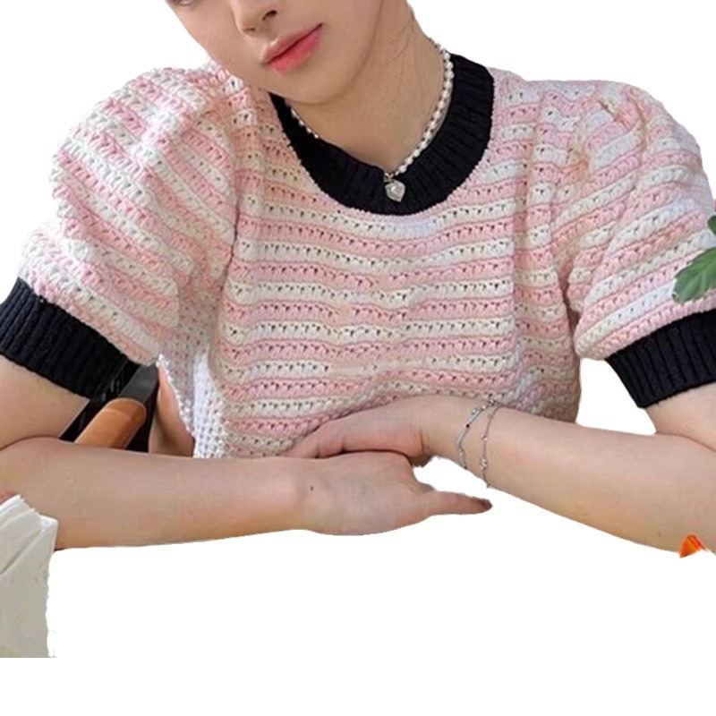 学院风法式小众条纹设计感针织衫夏季减龄打底毛衣镂空短袖上衣女