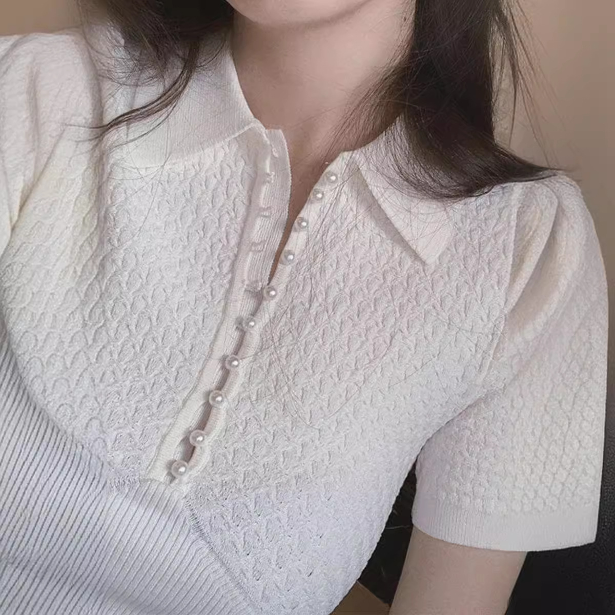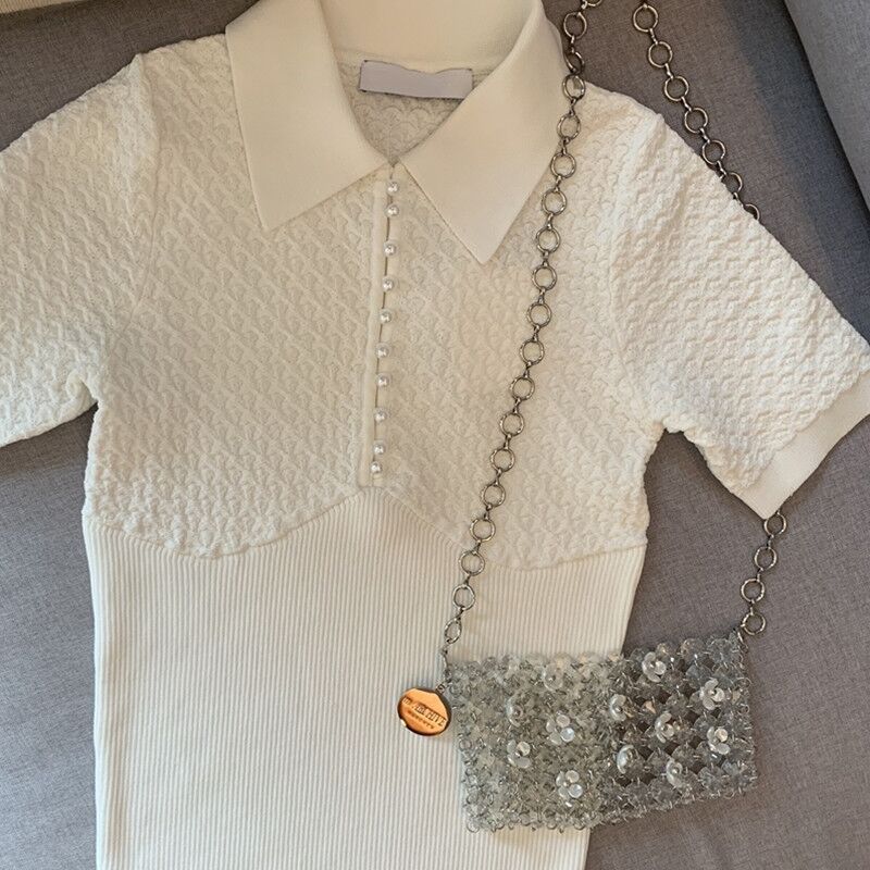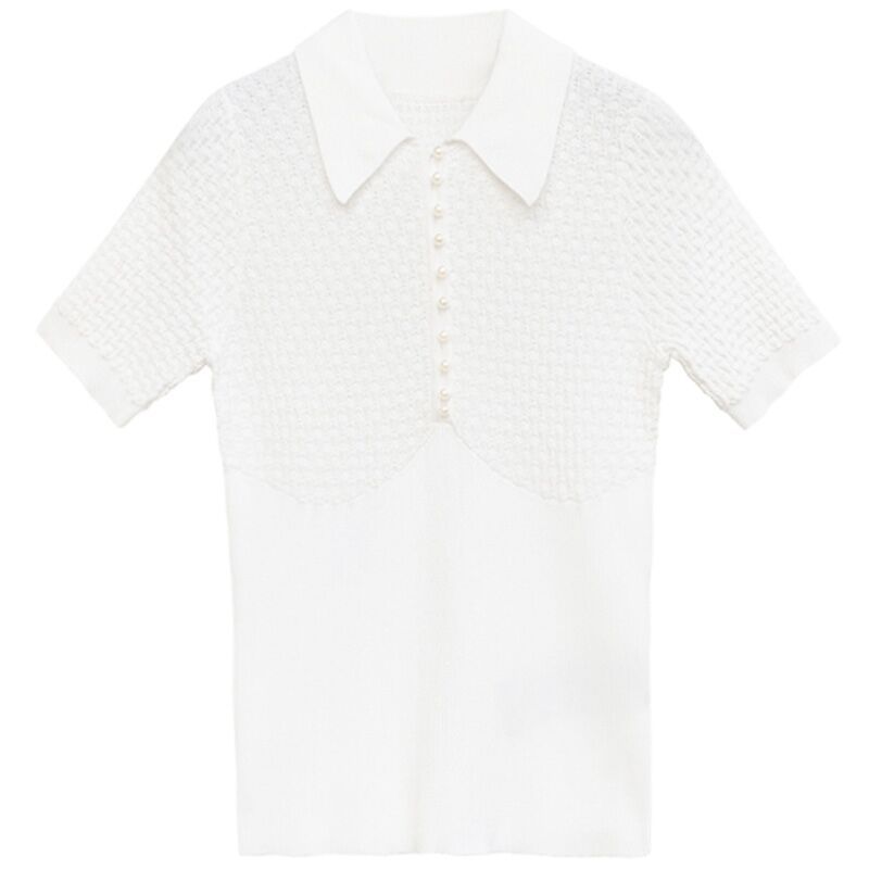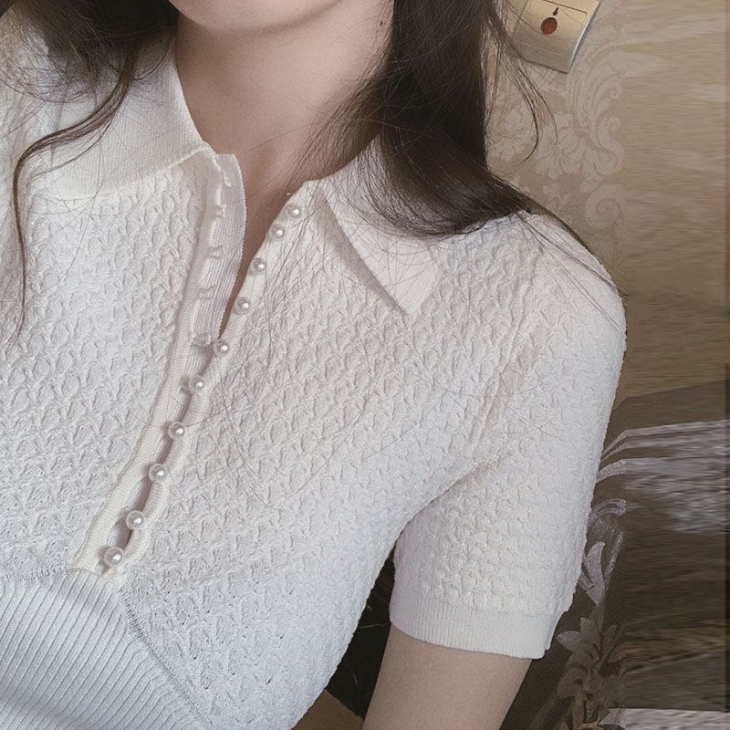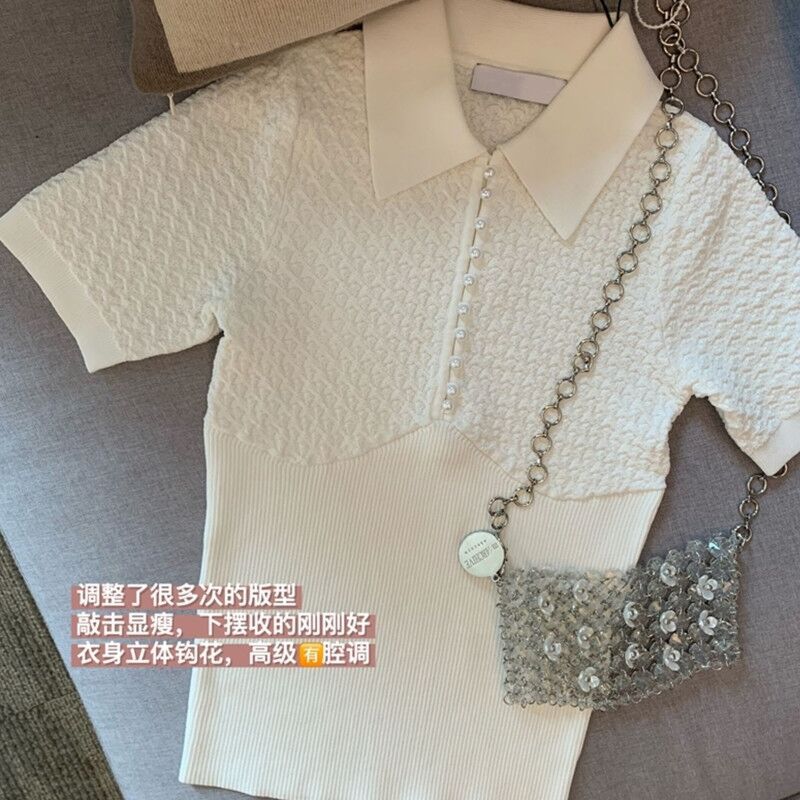 白色短袖针织衫女年夏季新款名媛气质显瘦洋气珍珠翻领上衣潮