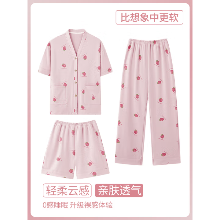 女士睡衣女三件套甜美薄款可外穿春夏季短袖短裤长裤