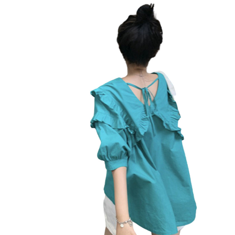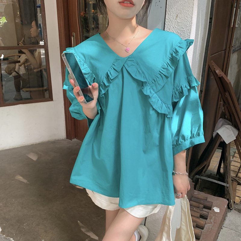 湖蓝泡泡袖娃娃领衬衫上衣女夏季新款小个子法式设计短袖衬衣