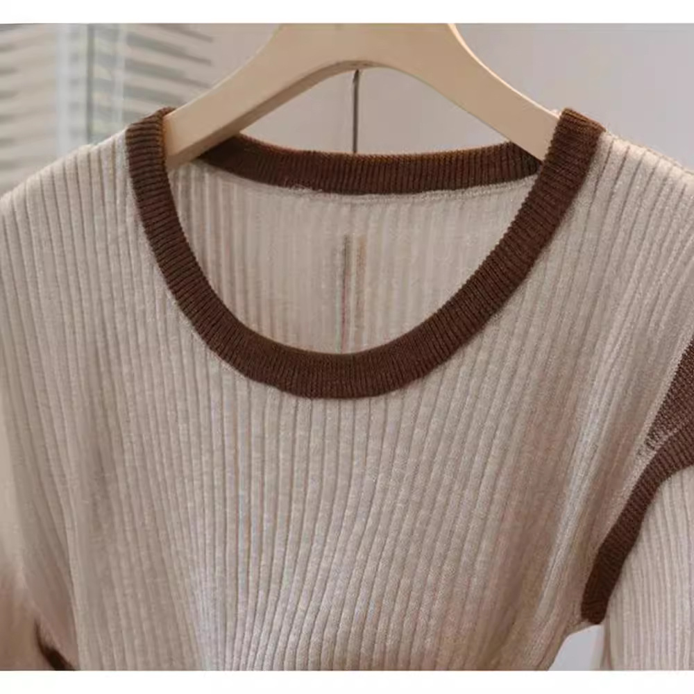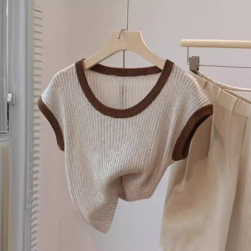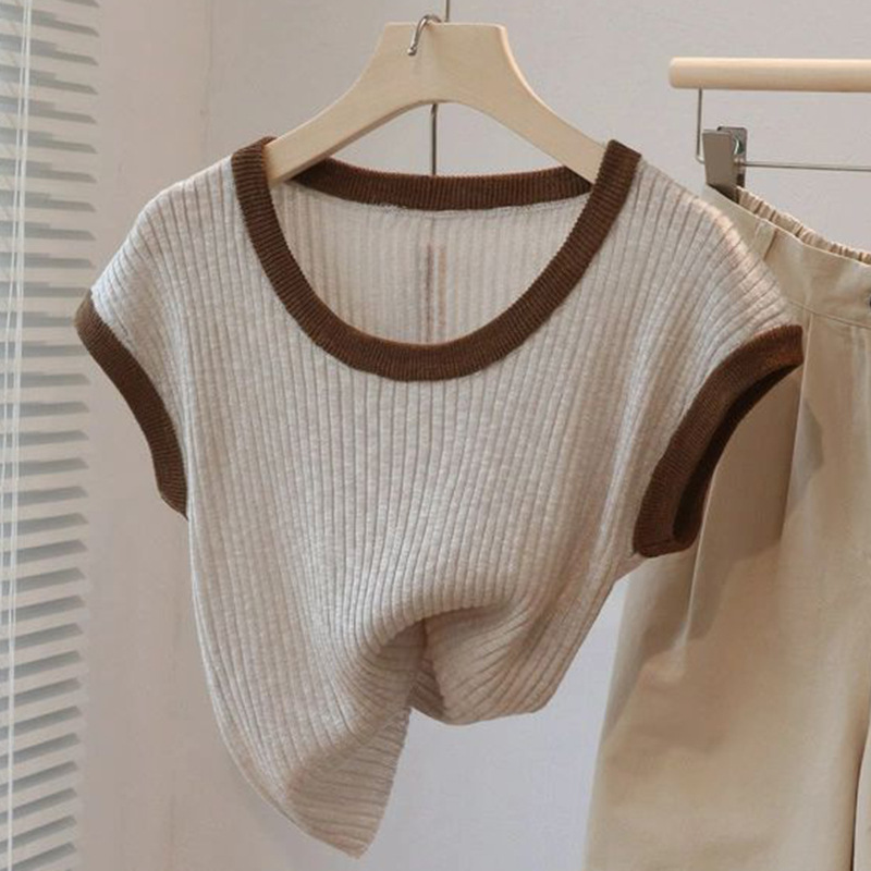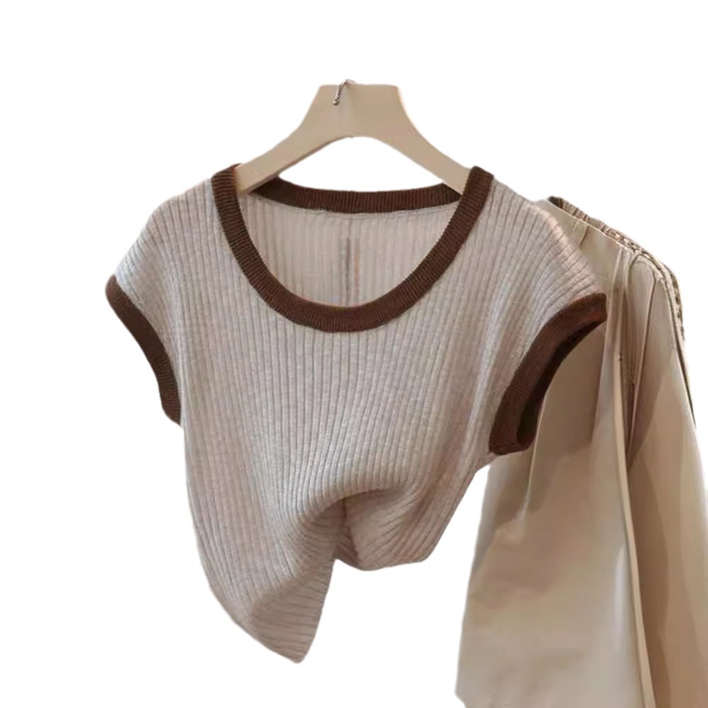 韩系正肩短袖T恤女夏季冰丝针织衫小众修身体恤别致辣妹短款上衣