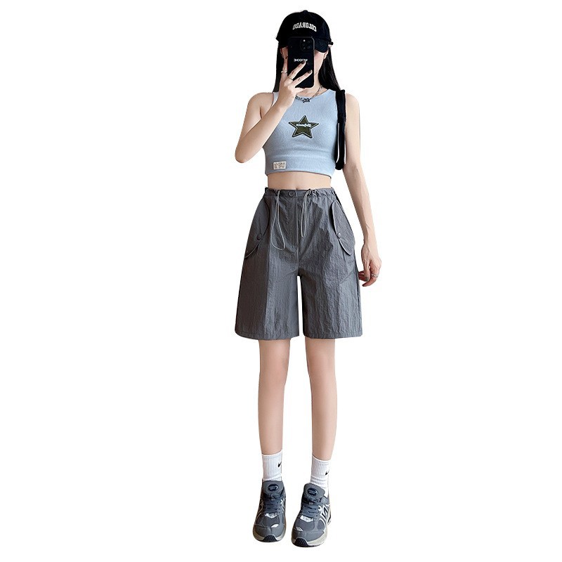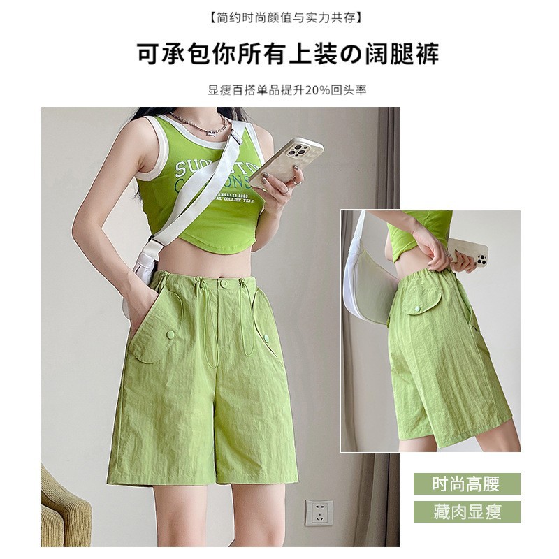 灰色工装短裤女夏季薄款高腰休闲直筒裤显瘦阔腿速干五分裤