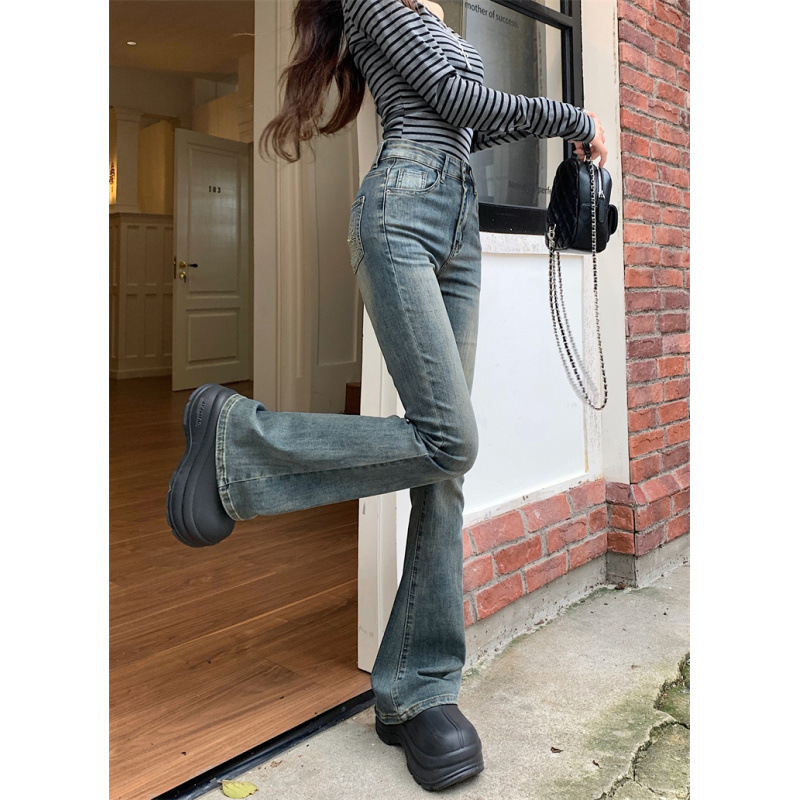 美式复古刺绣微喇牛仔裤女辣妹高腰修身字显瘦长裤