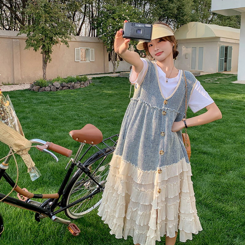 蓝色拼接V领设计感连衣裙两件套女夏季新款超好看背带裙套装