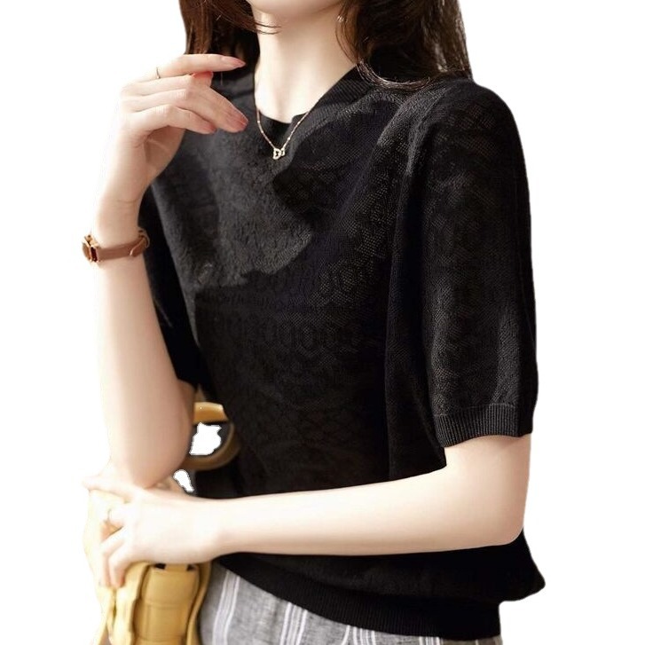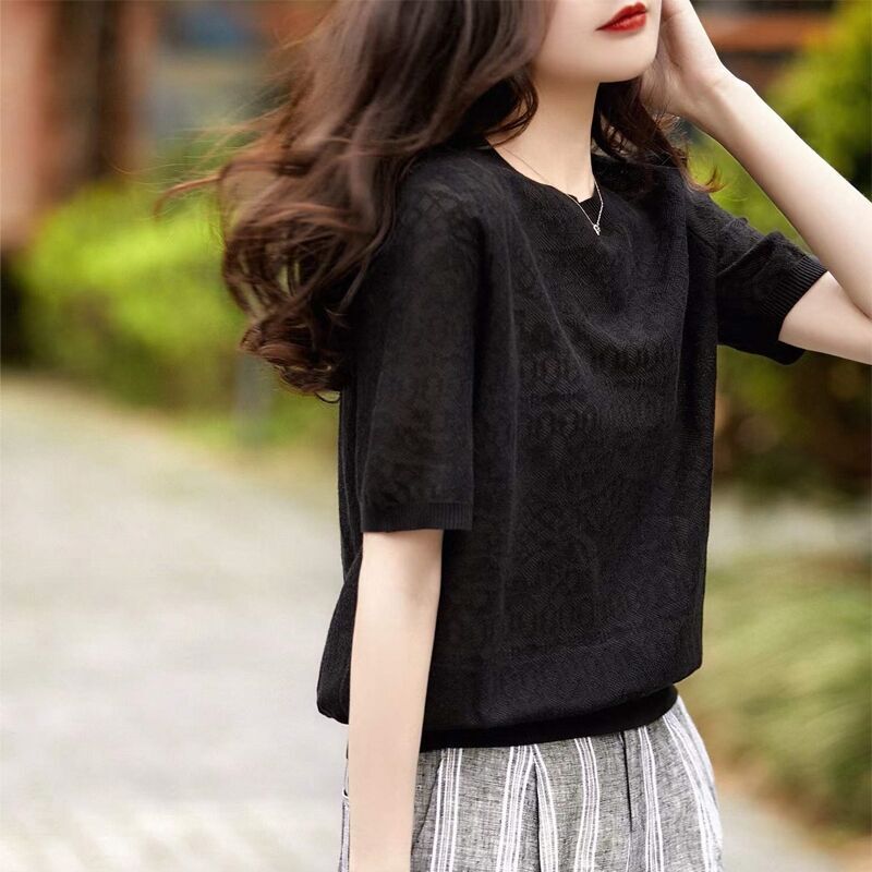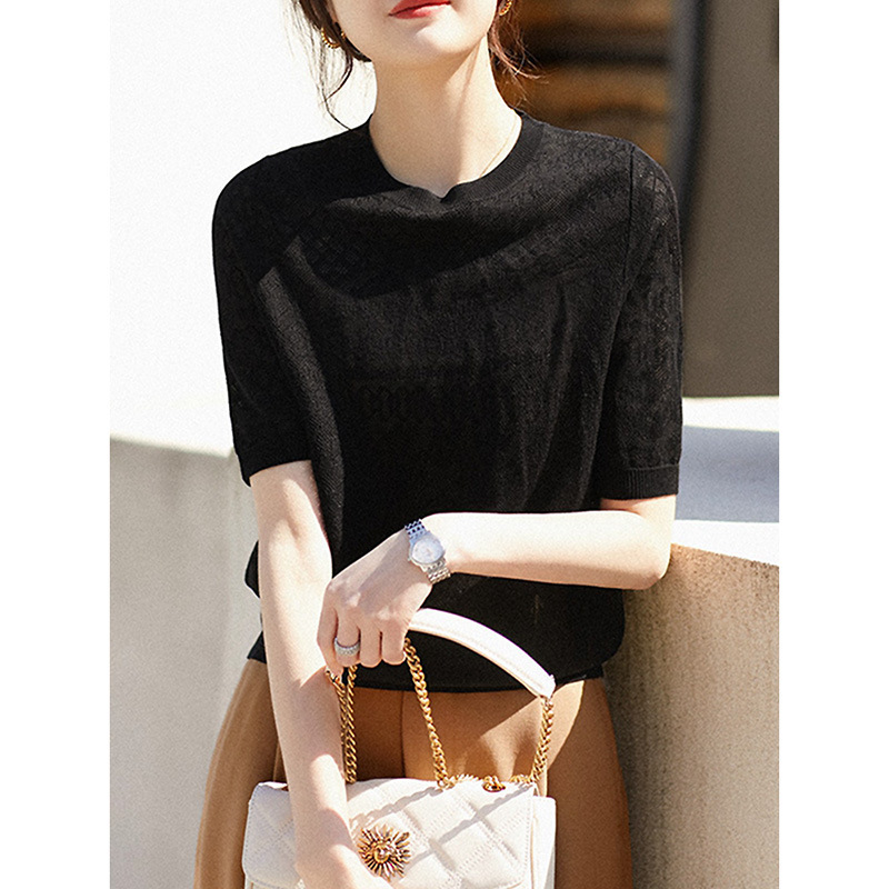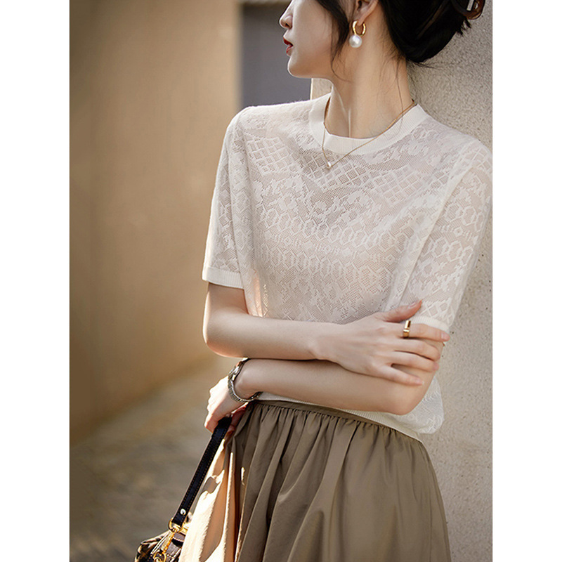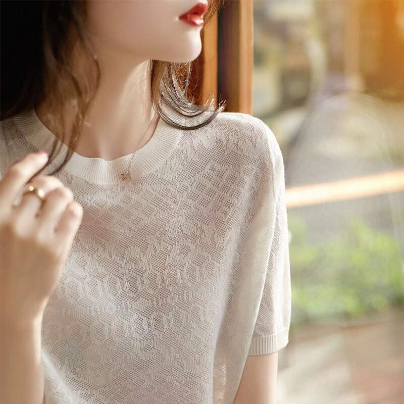 夏季新款白色冰丝短袖T恤宽松百搭气质圆领重工镂空针织上衣