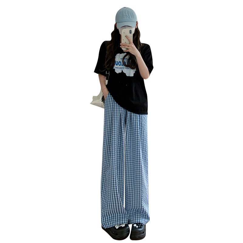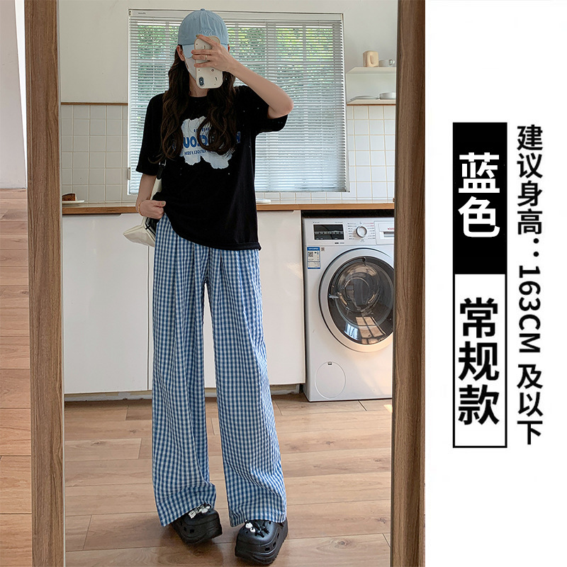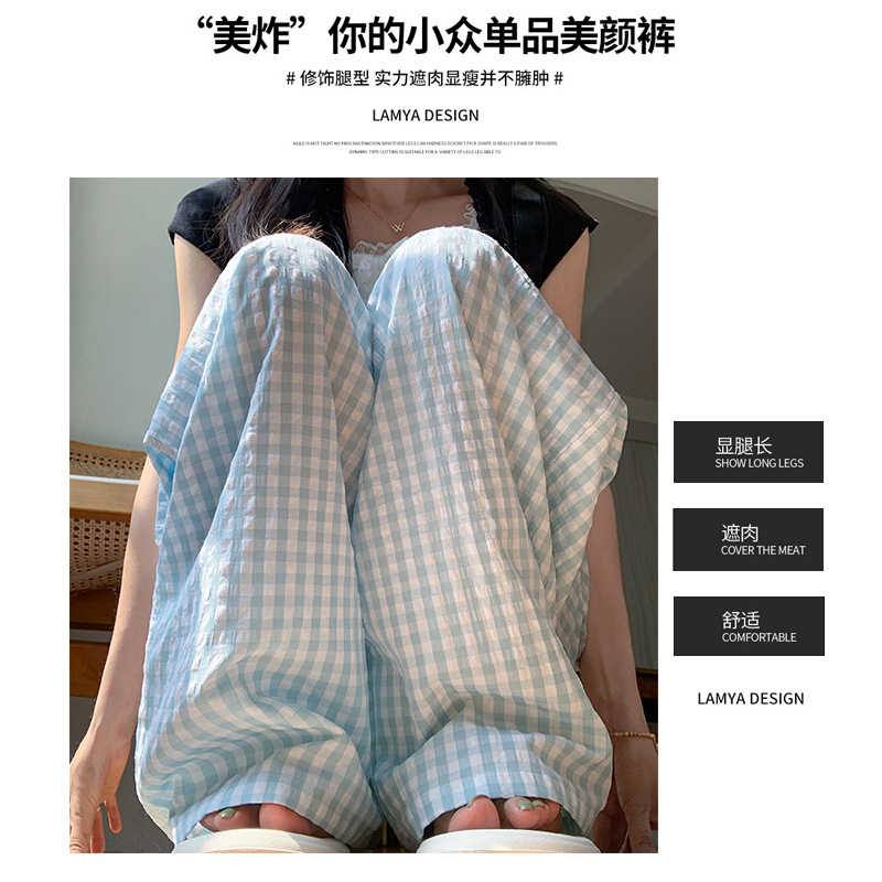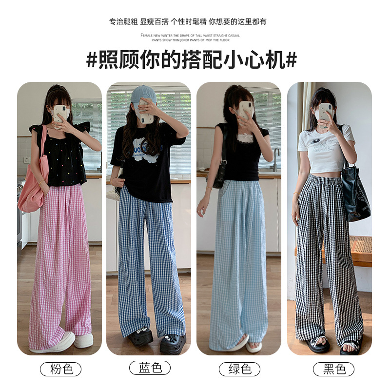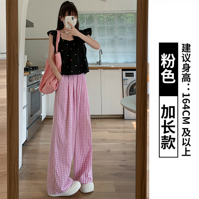 粉色格子阔腿裤女装裤子夏季女薄款高腰垂感休闲遛弯裤直筒山本裤