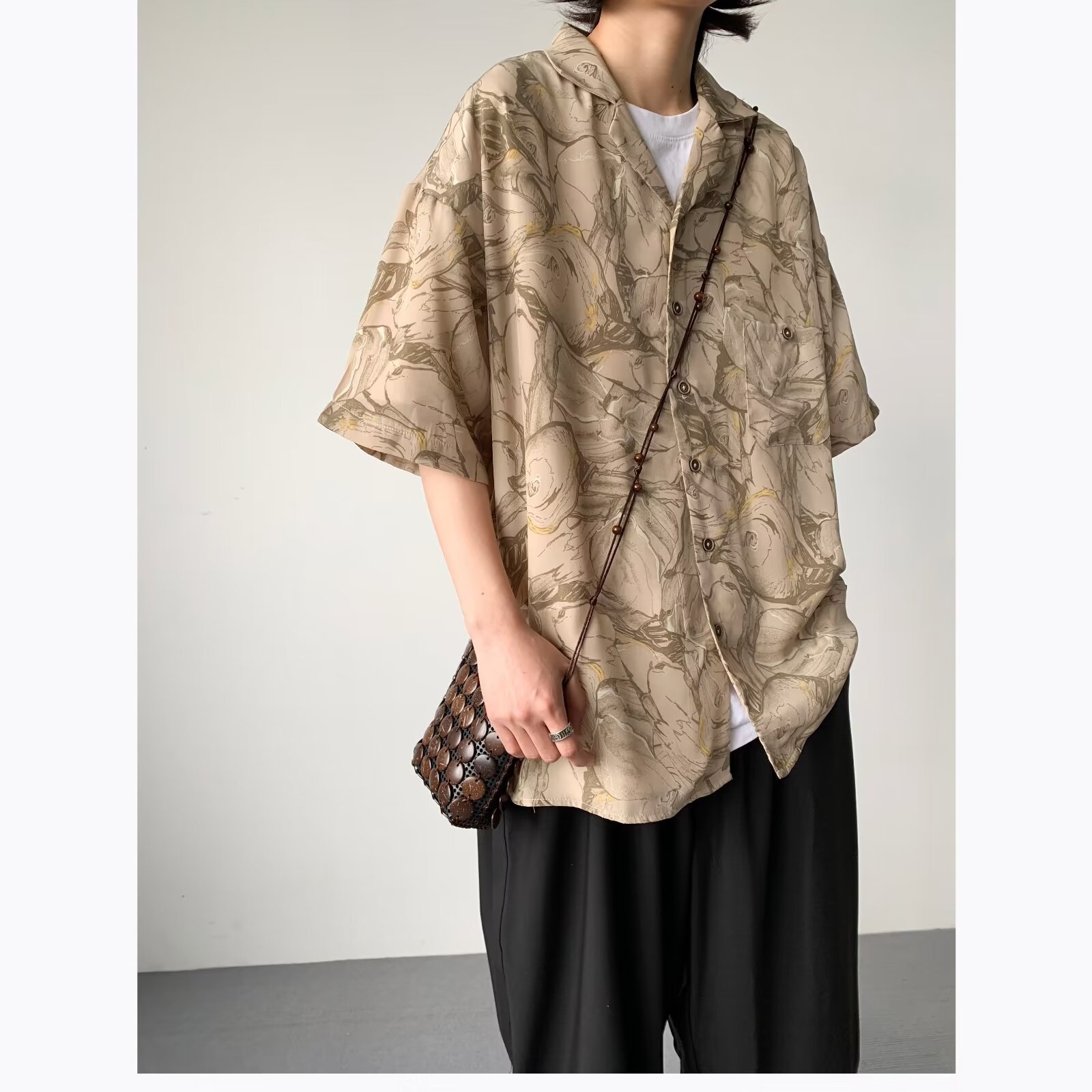 日系复古慵懒风线条几何短袖衬衫男夏日薄款宽松百搭潮流衬衣外套