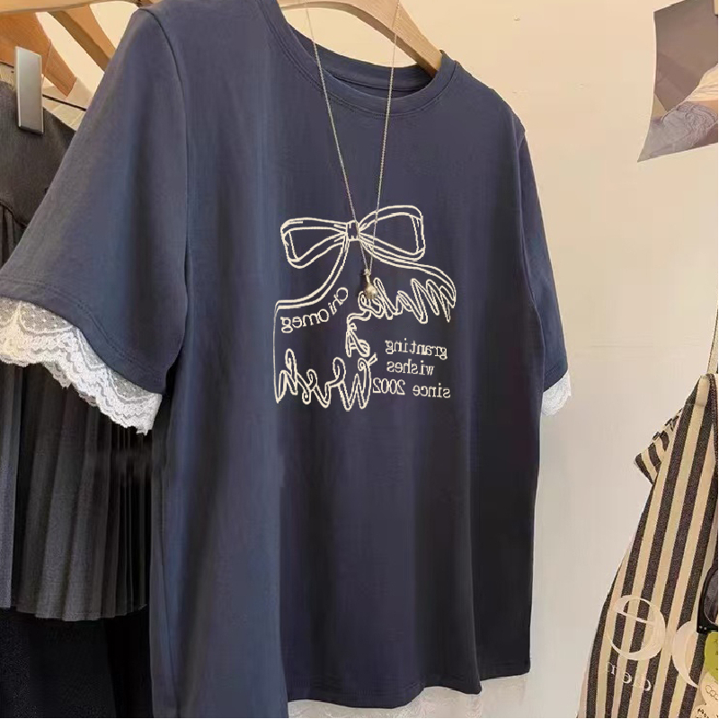 新款甜美慵懒风蝴蝶结印花蕾丝边设计感短袖T恤女夏季宽松上衣女