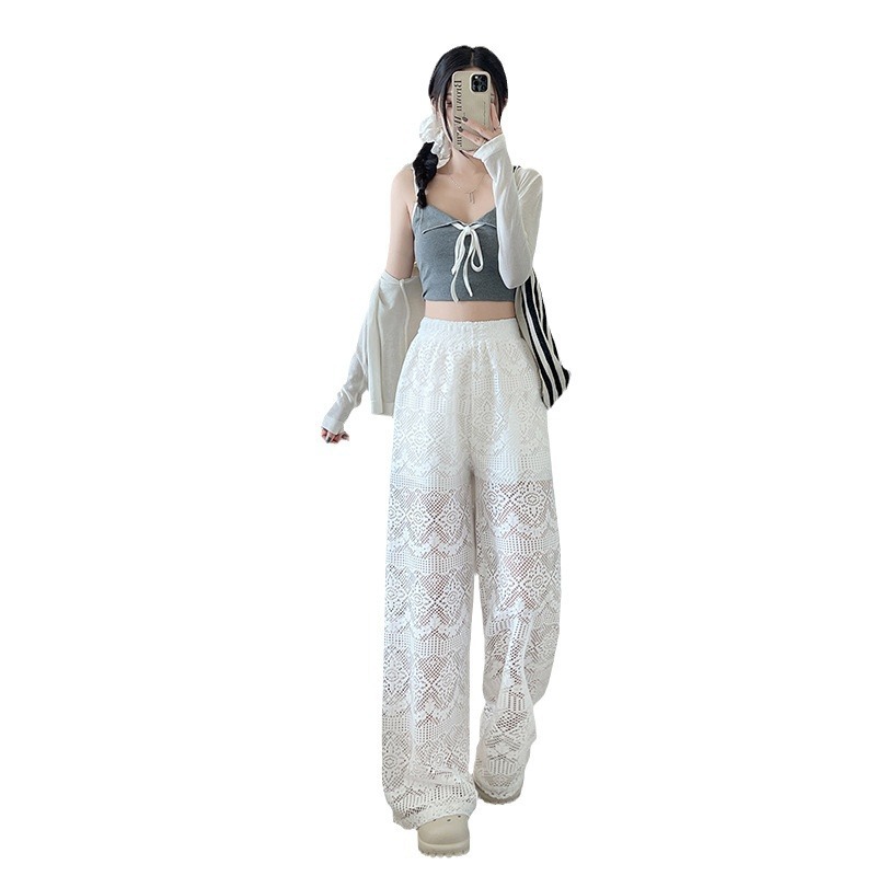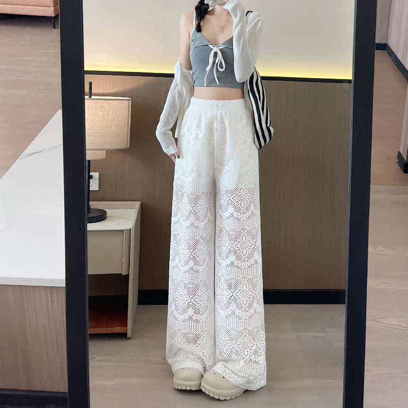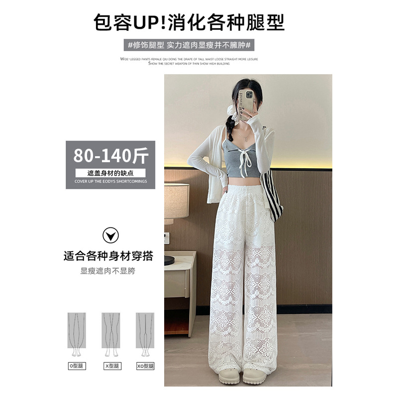 蕾丝花边腰阔腿裤夏季女装裤子女简约风显瘦休闲裤宽松高腰直筒裤