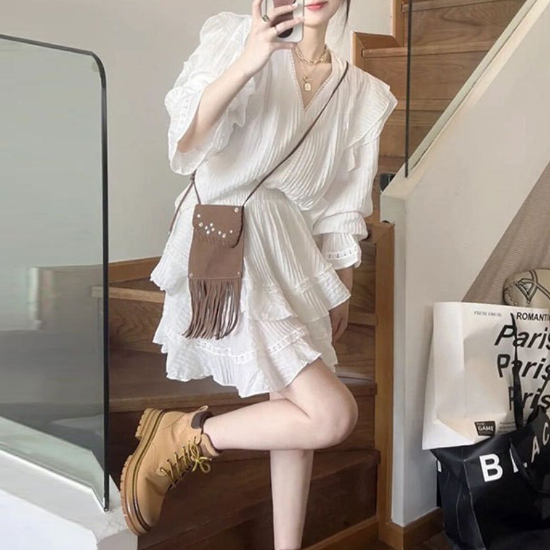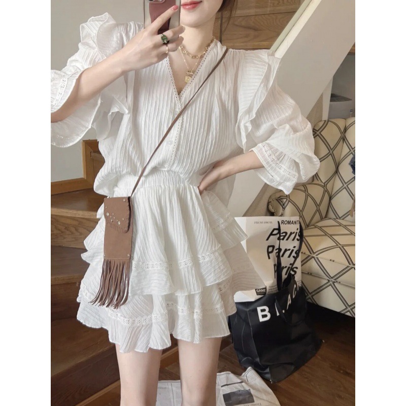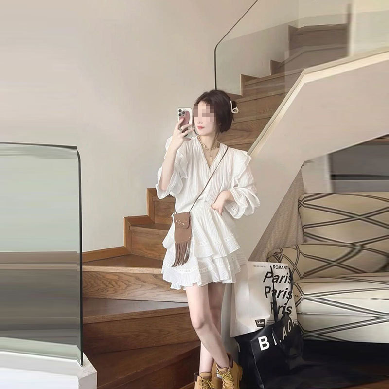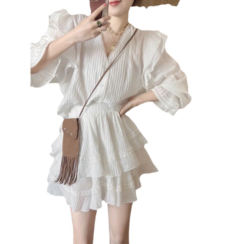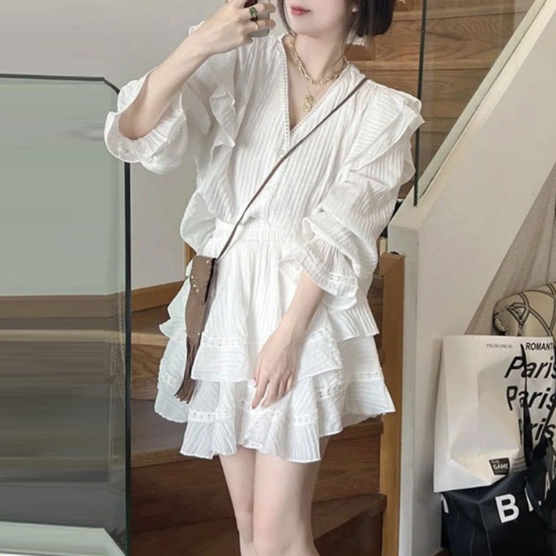 春夏新款女装法式V领荷叶边宽松仙女白色衬衫半身裙两件套装