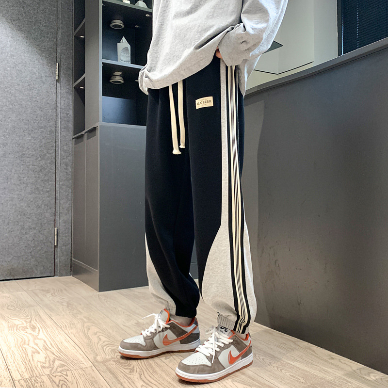 撞色拼接条纹卫裤男宽松夏季薄束脚运动裤男士高街美式vibe裤子男