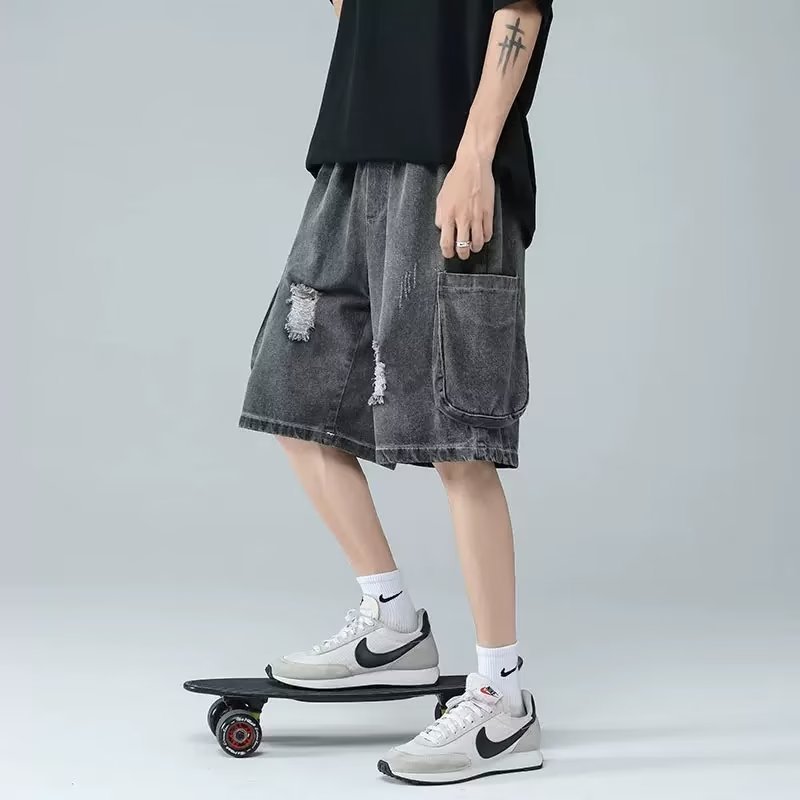 牛仔短裤男夏季港风宽松薄款水洗五分裤潮流帅气百搭小破洞牛仔裤