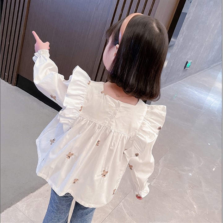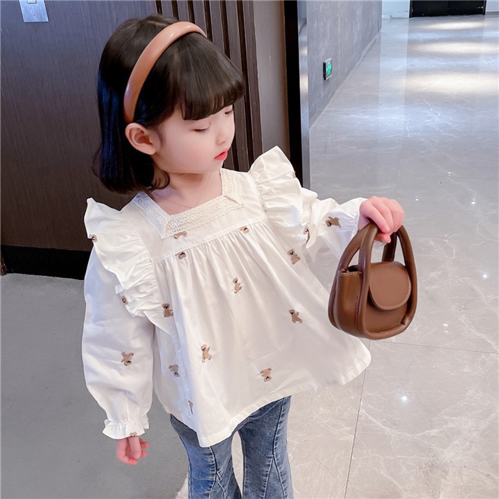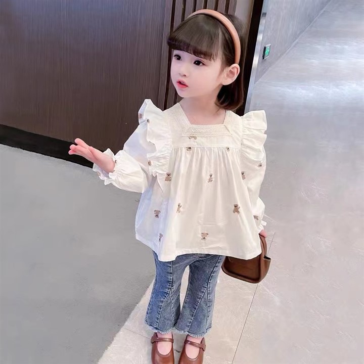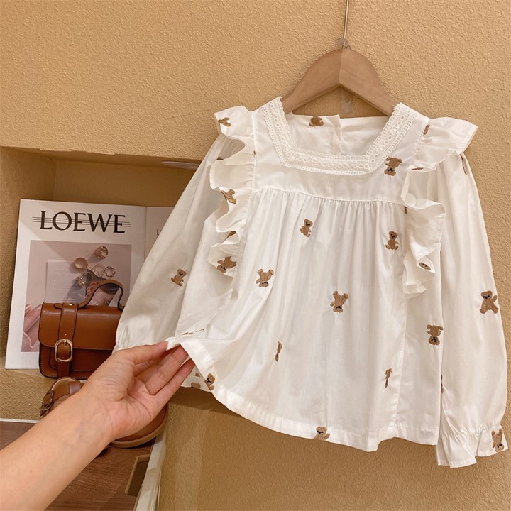 女童衬衫套装新款儿童方领花边绣花小熊衬衣韩版童装潮Q2150