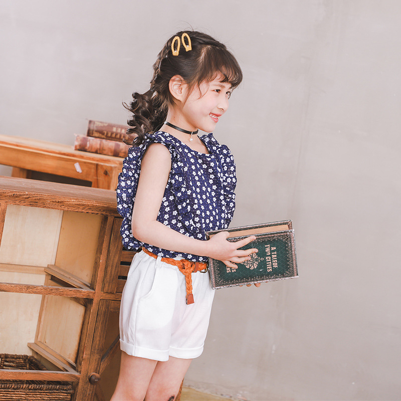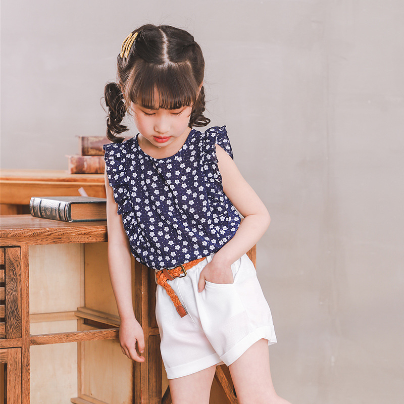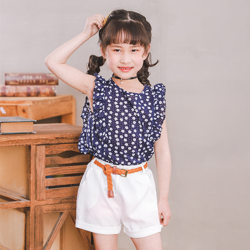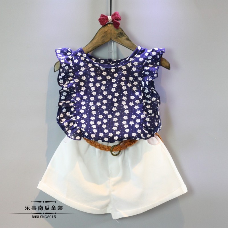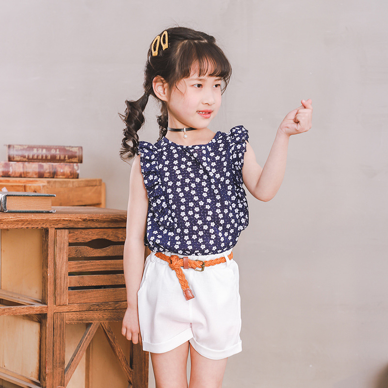 2019夏季韩版女童花朵碎花上衣+配白色短裤套装(送皮带)