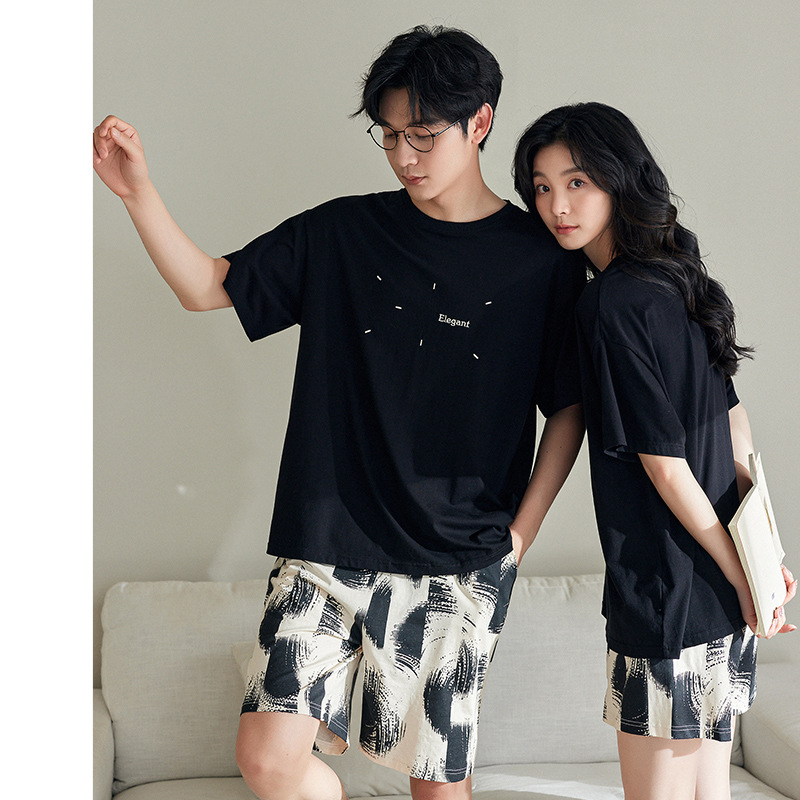 【凉感型】情侣睡衣夏季纯棉短袖黑色高级感简约男女款家居服套装