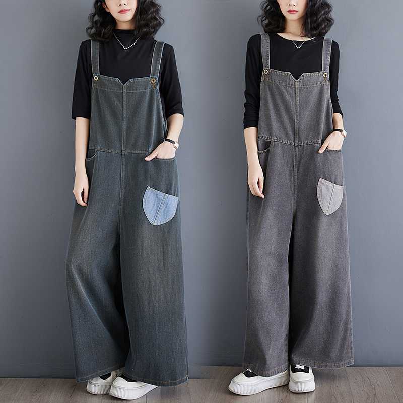 实拍现货春夏新款复古牛仔宽松大码复古怀旧牛仔阔腿背带裤女